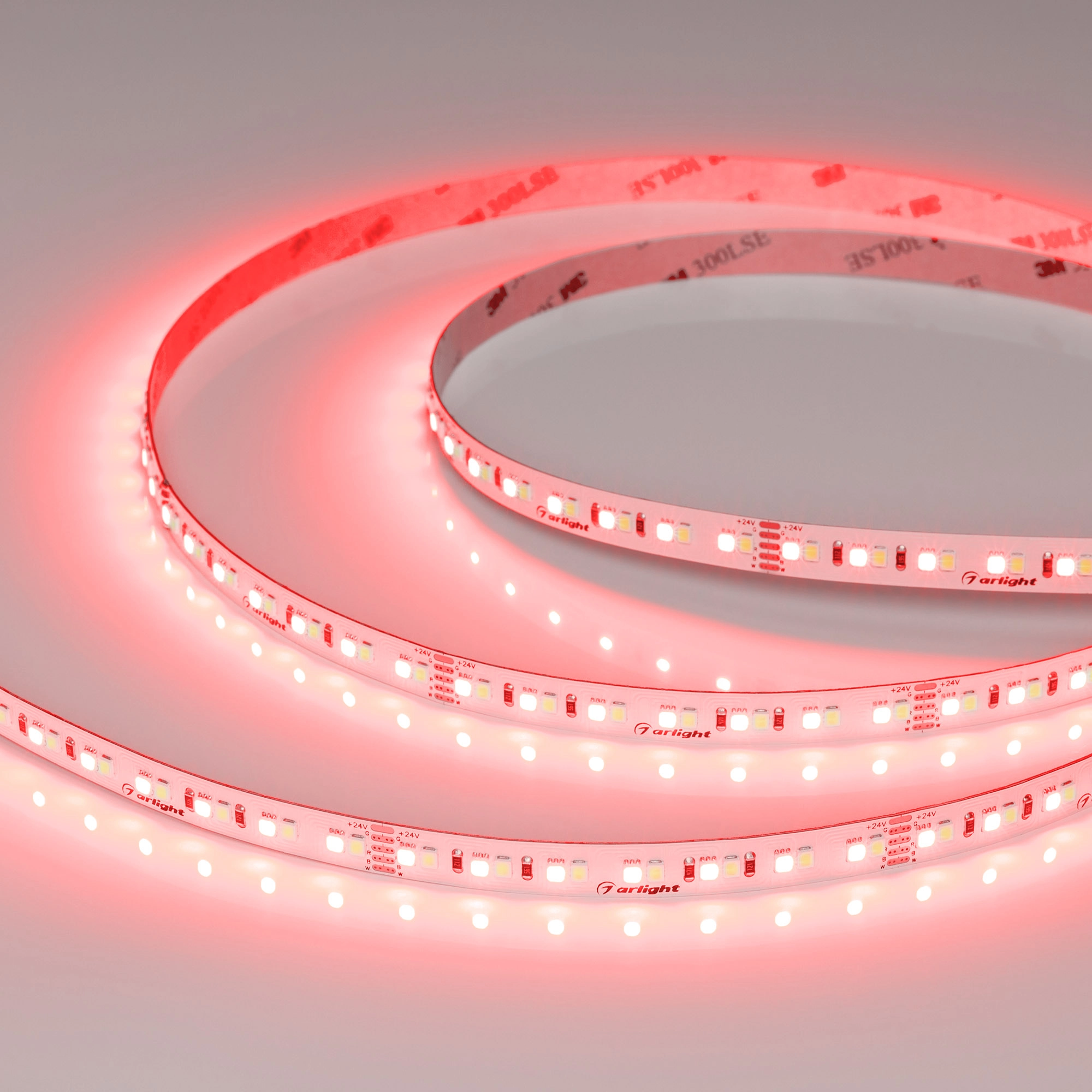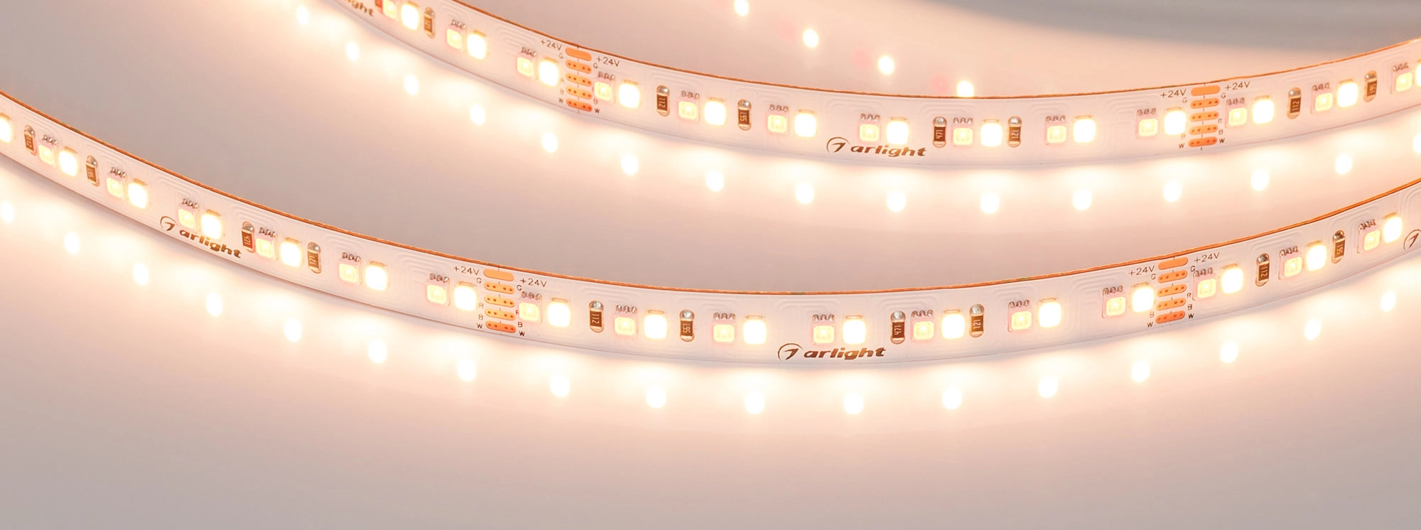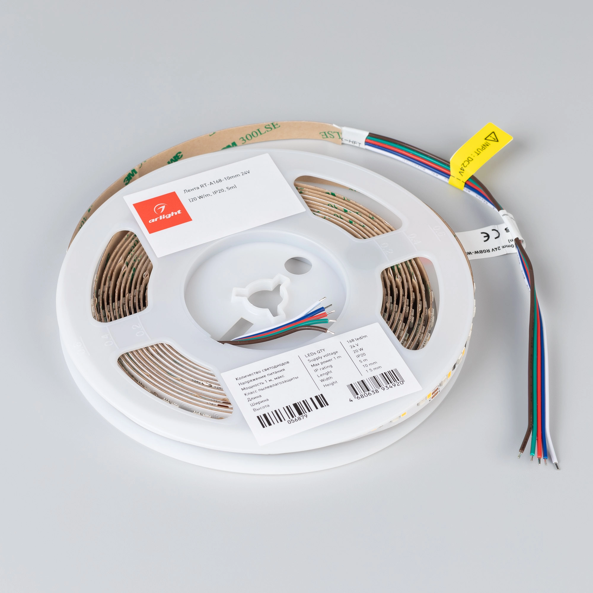 Светодиодная мультицветная лента RT серии A168. Светодиоды SMD 2835, 168 шт/м, белая плата шириной 10 мм, скотч 3M. Цвет RGB + ТЕПЛЫЙ 3000K, световая эффективность белого 150 лм/Вт, индекс цветопередачи CRI>90, угол 120°. Питание 24 В, мощность 20 Вт/м (100 Вт на 5 м). Размеры 5000x10x1.5 мм. Мин.отрезок 83.33 мм, 14 светодиодов. Цена за 1 м. Обязательна установка на профиль.