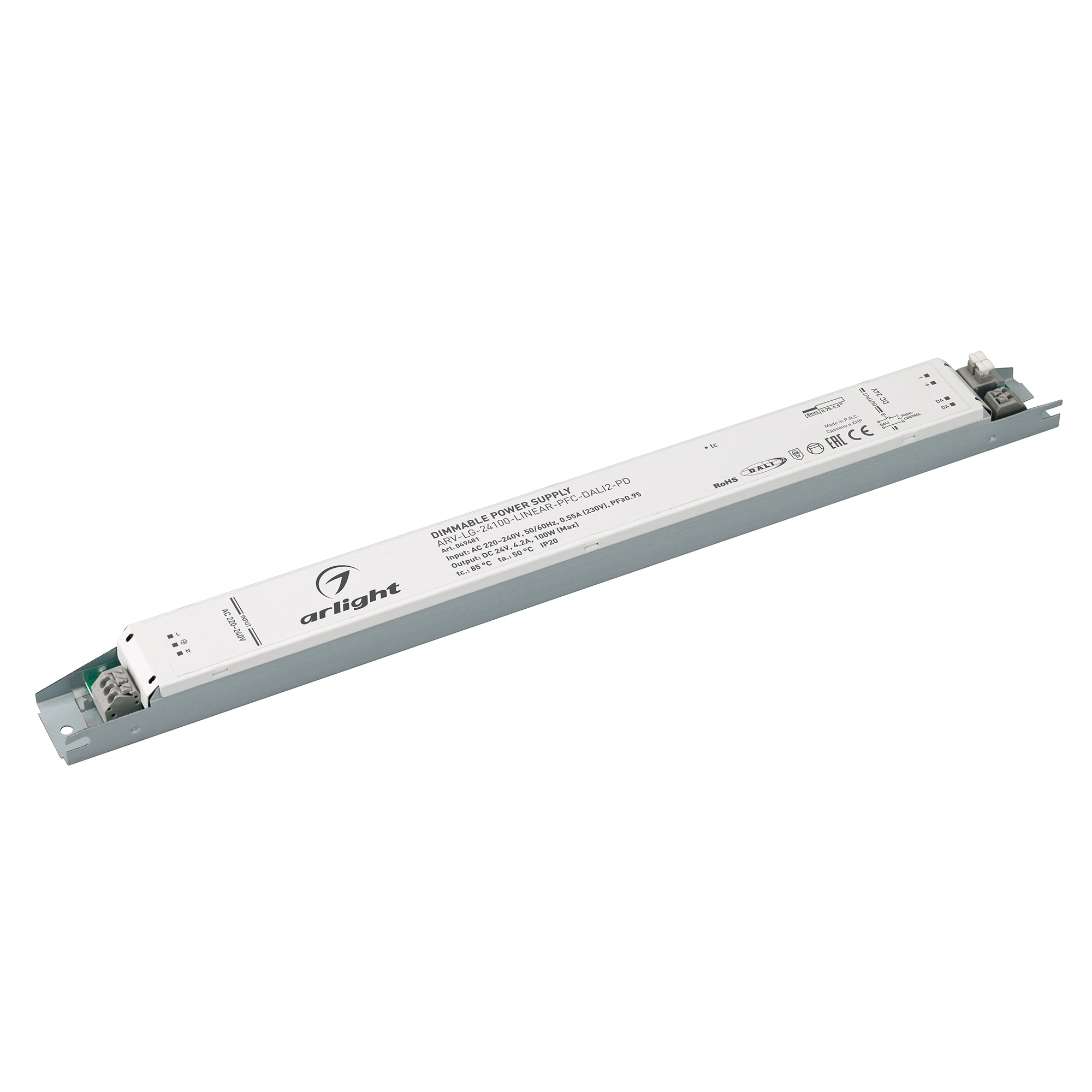 Диммируемый источник напряжения по протоколу DALI 2.0 и функцией PUSH DIM с гальванической развязкой для светодиодных изделий. Входное напряжение 220-240 VAC. Выходные параметры: 24 В, 4,2 А, 100 Вт. Встроенный PFC >0,97. Негерметичный алюминиевый корпус IP 20. Габаритные размеры длина 280 мм, ширина 30 мм, высота 21 мм. Гарантийный срок 5 лет.