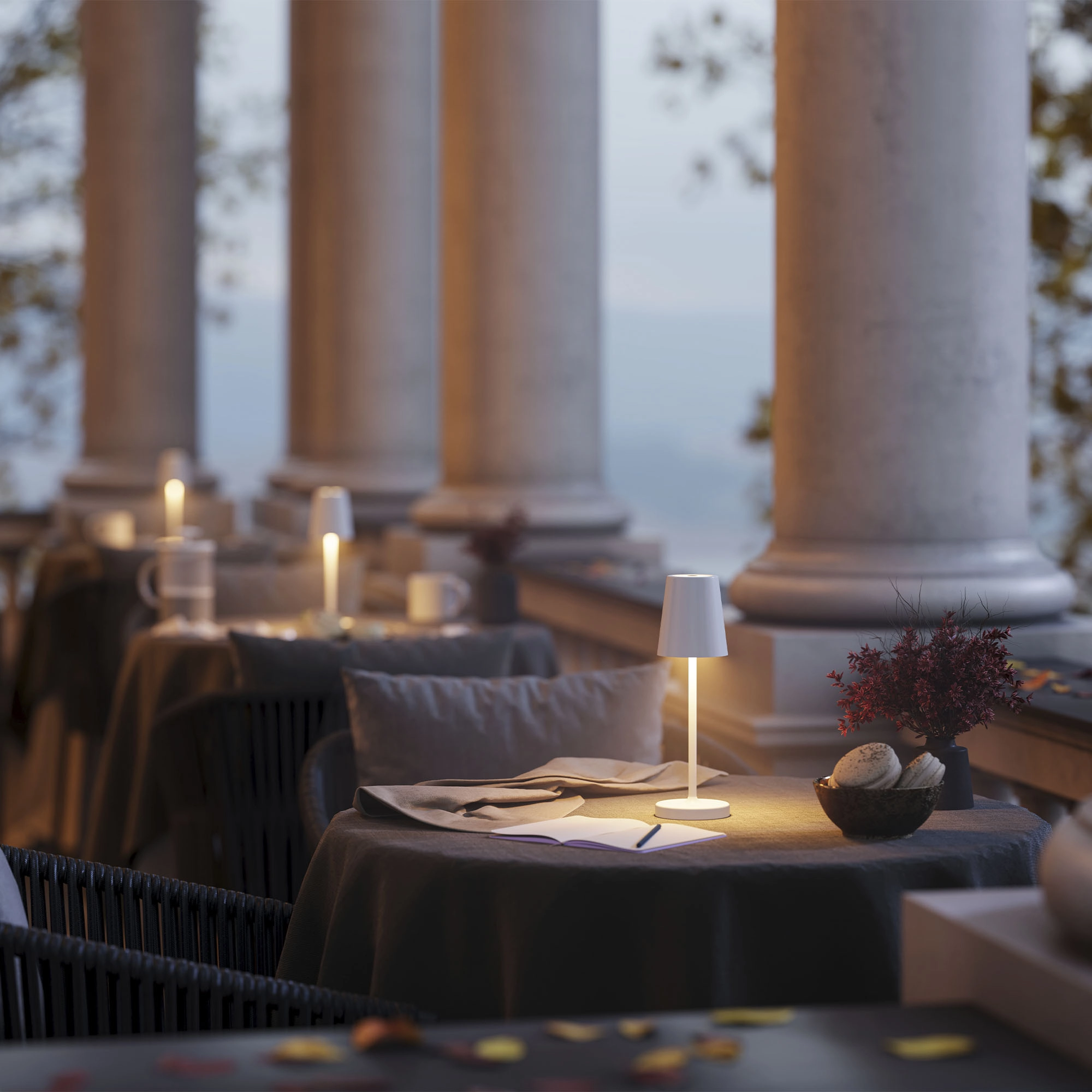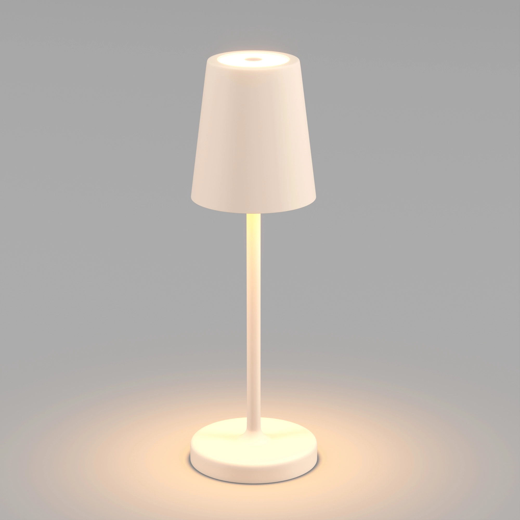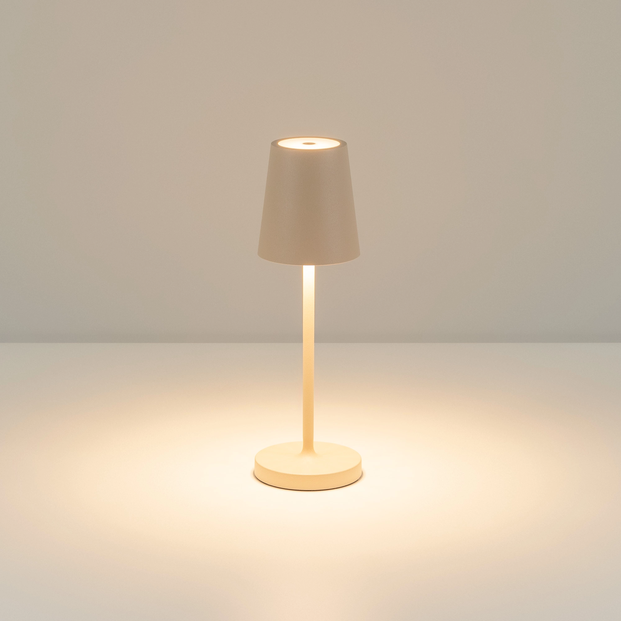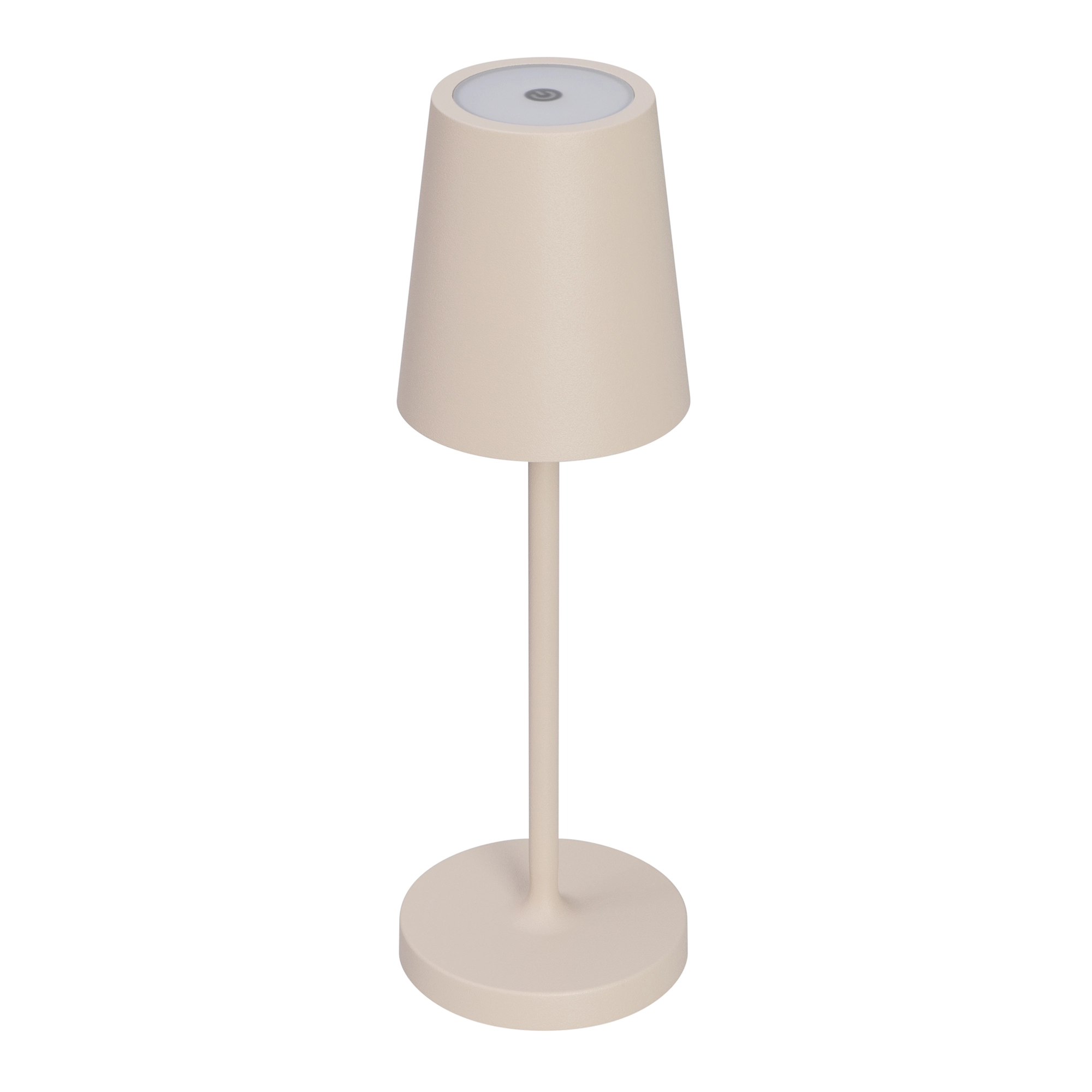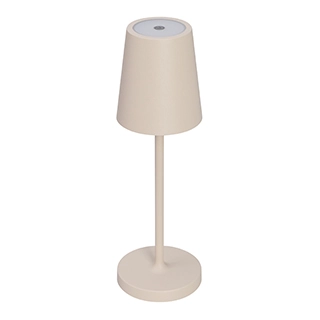 Настольный светильник со встроенным аккумулятором 1.5Вт, алюминиевый корпус, цвет песочный. Цвет ТЕПЛЫЙ БЕЛЫЙ 2200-3000K, св.поток 110-130 лм, CRI(Ra)>80, угол 90°. Размер Ф80x250мм. IP54. Зарядка от сети переменного тока AC220-240V. Тип встроенного аккумулятора 1500мАч Li-ion, напряжение батареи 3.7V