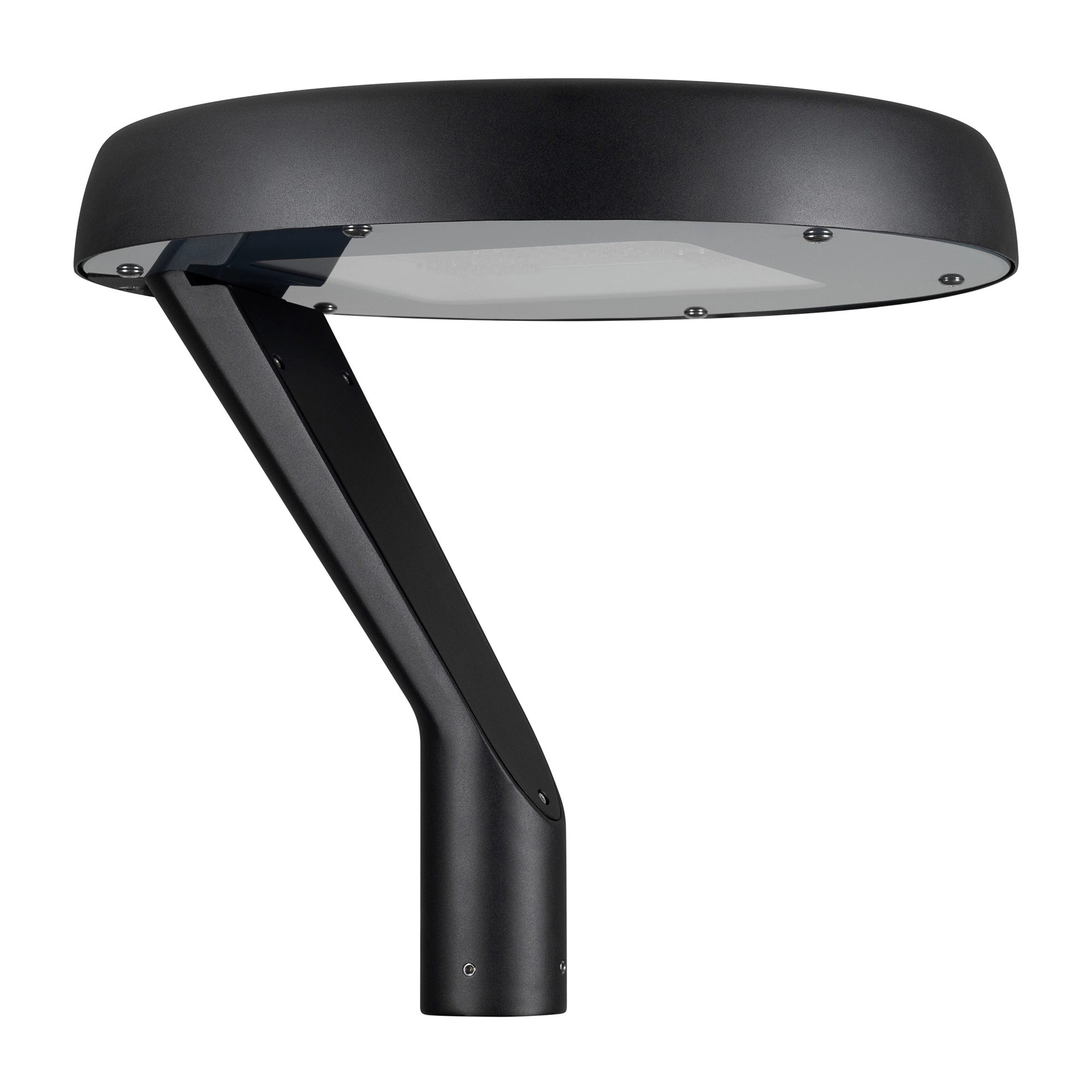 Венчающий светодиодный светильник. Мощность 50 Вт, св. поток 7100 лм, 141 лм/Вт, тёплый 3000 K, CRI>80, угол 145x40°, напряжение питания 230 В. Черный корпус из алюминия, экран стекло, степень защиты IP65. Размер: диаметр 510 мм, высота 480 мм. Монтаж на вертикальную опору диаметром 76 мм.