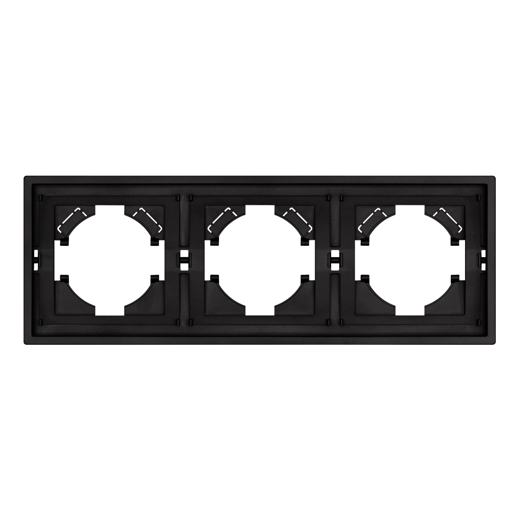 Рамка пластиковая на 3 поста, под встраиваемый механизм. Цвет - черный, с Soft-Touch покрытием.  Среднего уровня герметичности IP20. Ориентация монтажа горизонтальная.