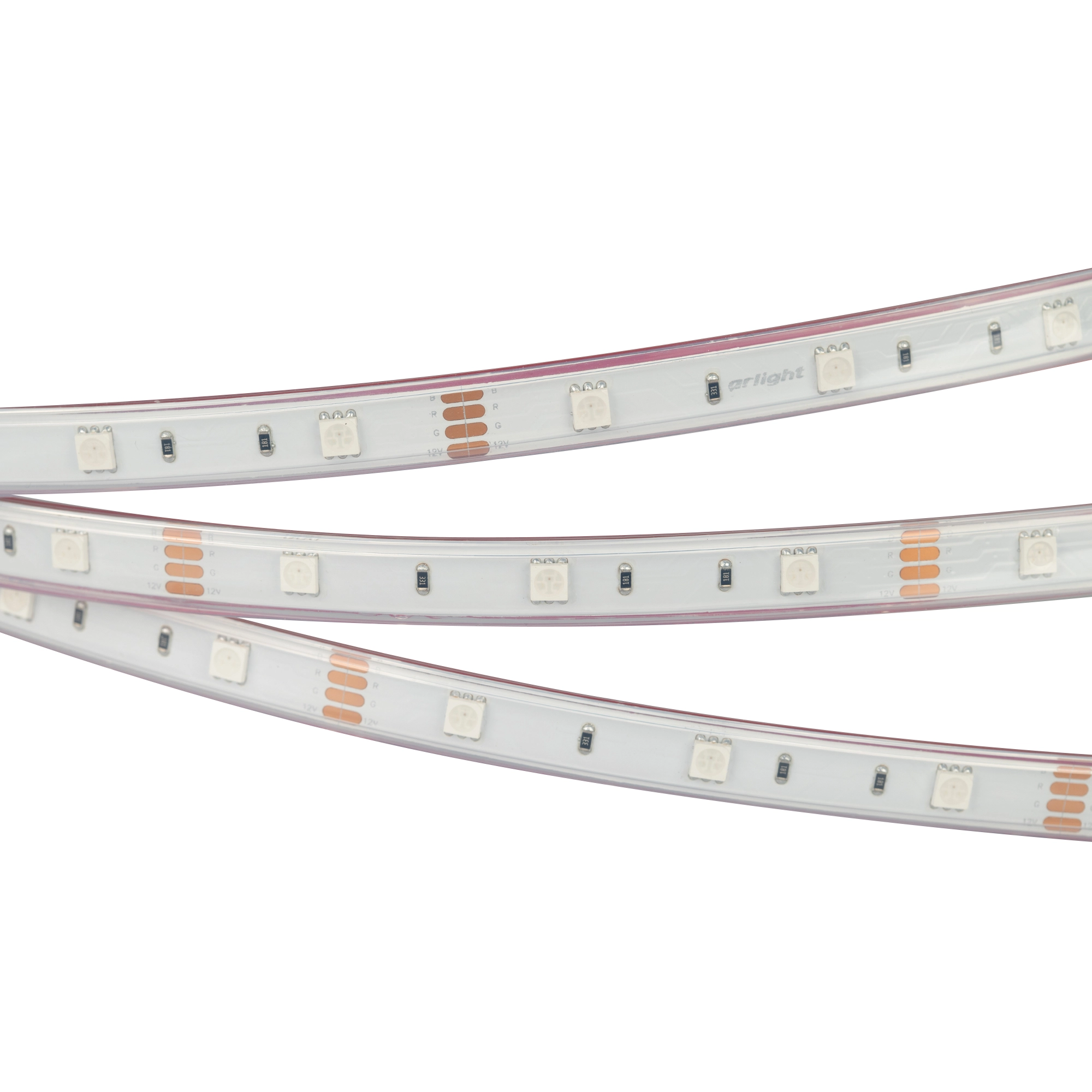 Мультицветная герметичная светодиодная лента RTW серии B30, IP67, PS - силиконовая экструзия. Светодиоды SMD 5060, 30 шт/м, белая плата шириной 10 мм, скотч 3M. Цвет RGB. Питание 12 В, мощность 7.2 Вт/м (36 Вт на 5 м), угол 120°. Размеры 5000x13x5 мм. Мин. отрезок 100 мм, 3 светодиода. Цена за 1 м.