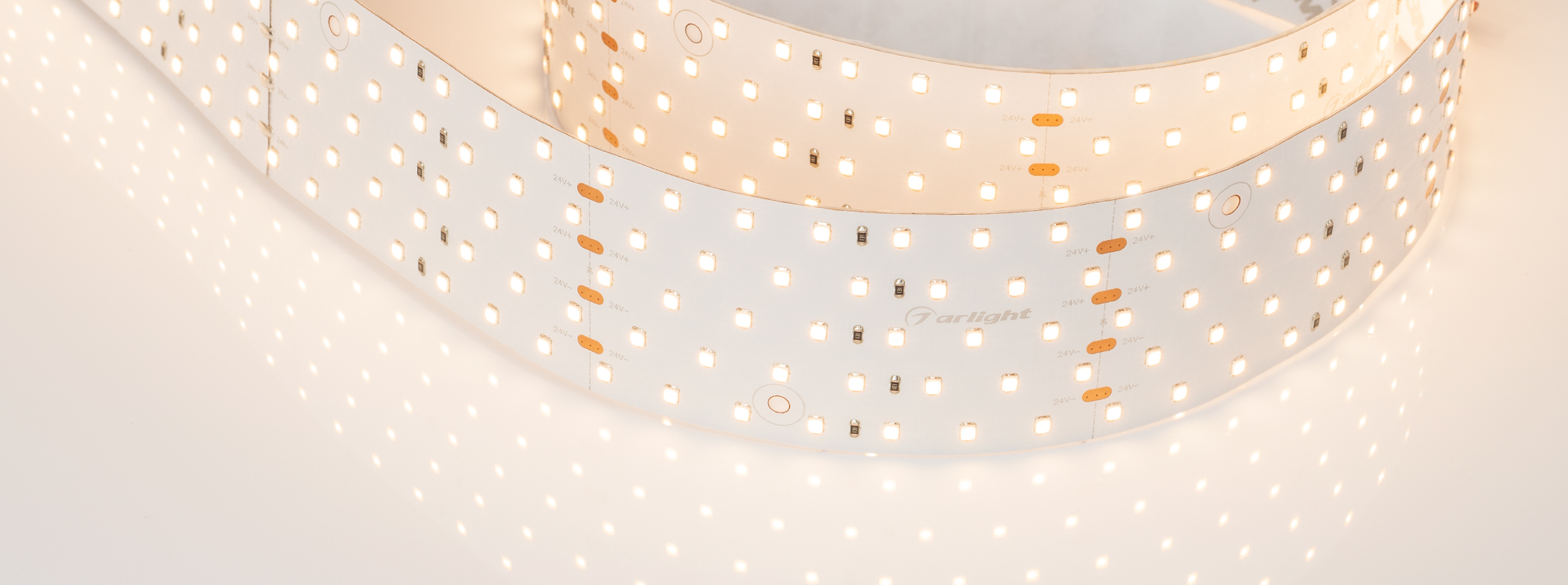 Поставка под заказ от 1000 м.Гибкая лента CRI98, светодиоды smd 2835, 350 шт/м (875шт на 2.5м), белая плата 58 мм, скотч 3М. Цвет ТЁПЛЫЙ 2600-2800K. Питание 24V, мощность 36 Вт/м (90 Вт на 2.5м), угол 120°, высокая цветопередача CRI>95...98. Размеры 2500х58x1.5мм. Мин.отрезок 100мм, 35 светодиодов. Цена за 1м.