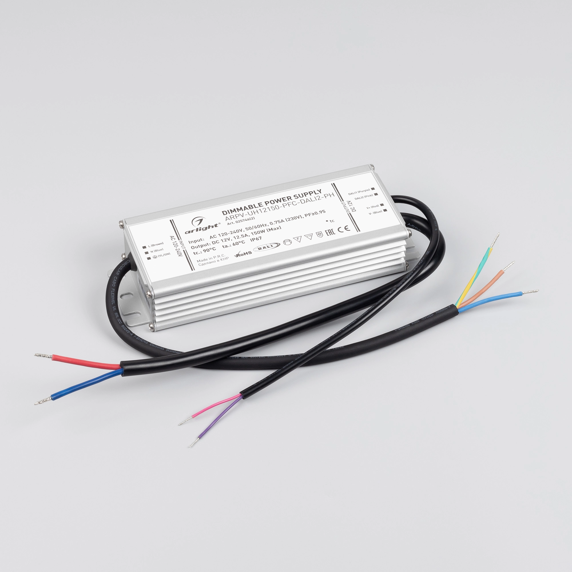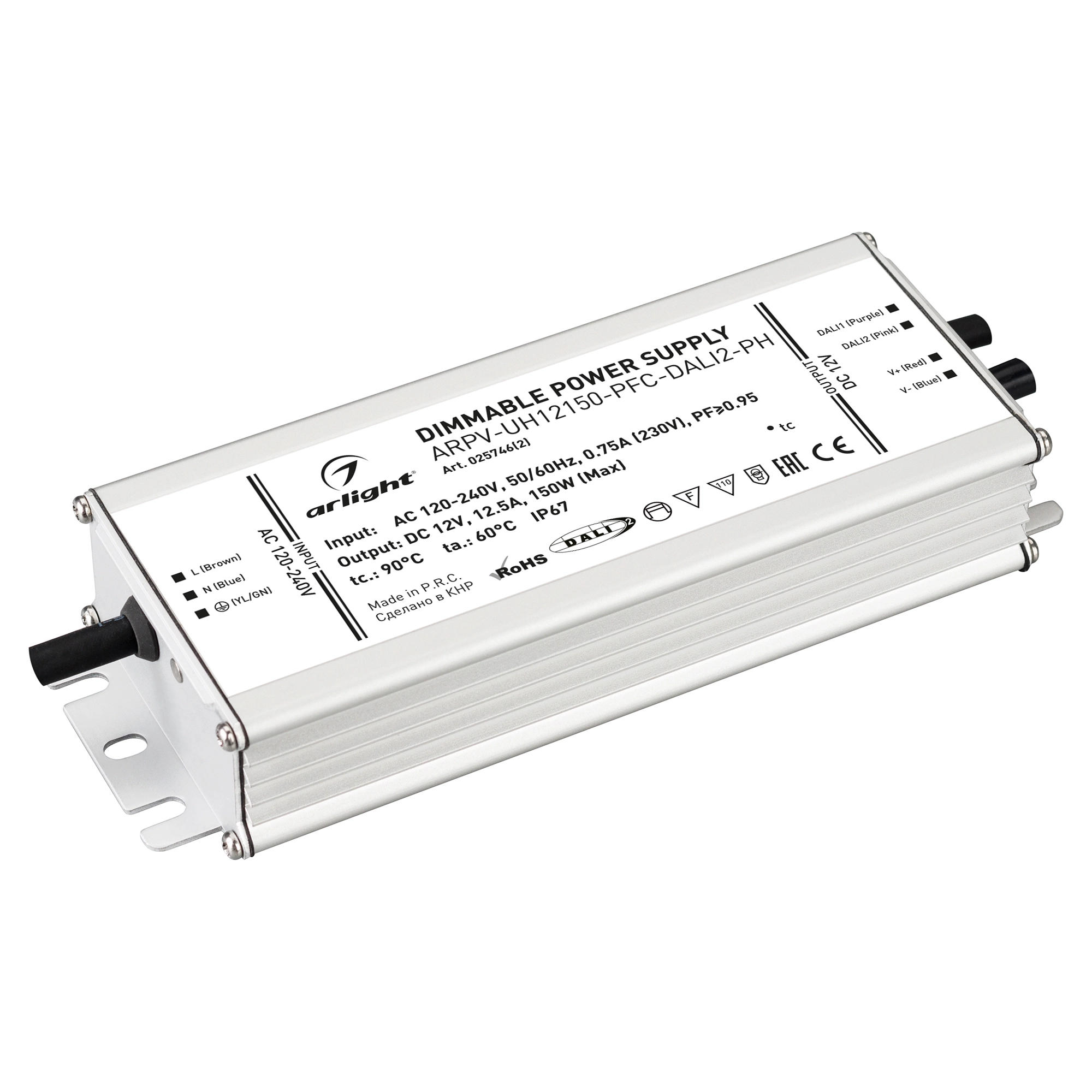 Диммируемый источник напряжения по протоколу DALI2.0 с гальванической развязкой для светодиодных изделий. Входное напряжение 120-240 VAC. Выходные параметры: 12 В, 12.5 А, 150 Вт. Встроенный PFC >0.95. Герметичный алюминиевый корпус IP 67. Рабочая температура -40…+70C⁰. Габаритные размеры длина 188 мм, ширина 67.5 мм, высота 33.5 мм. Гарантийный срок 7 лет.
