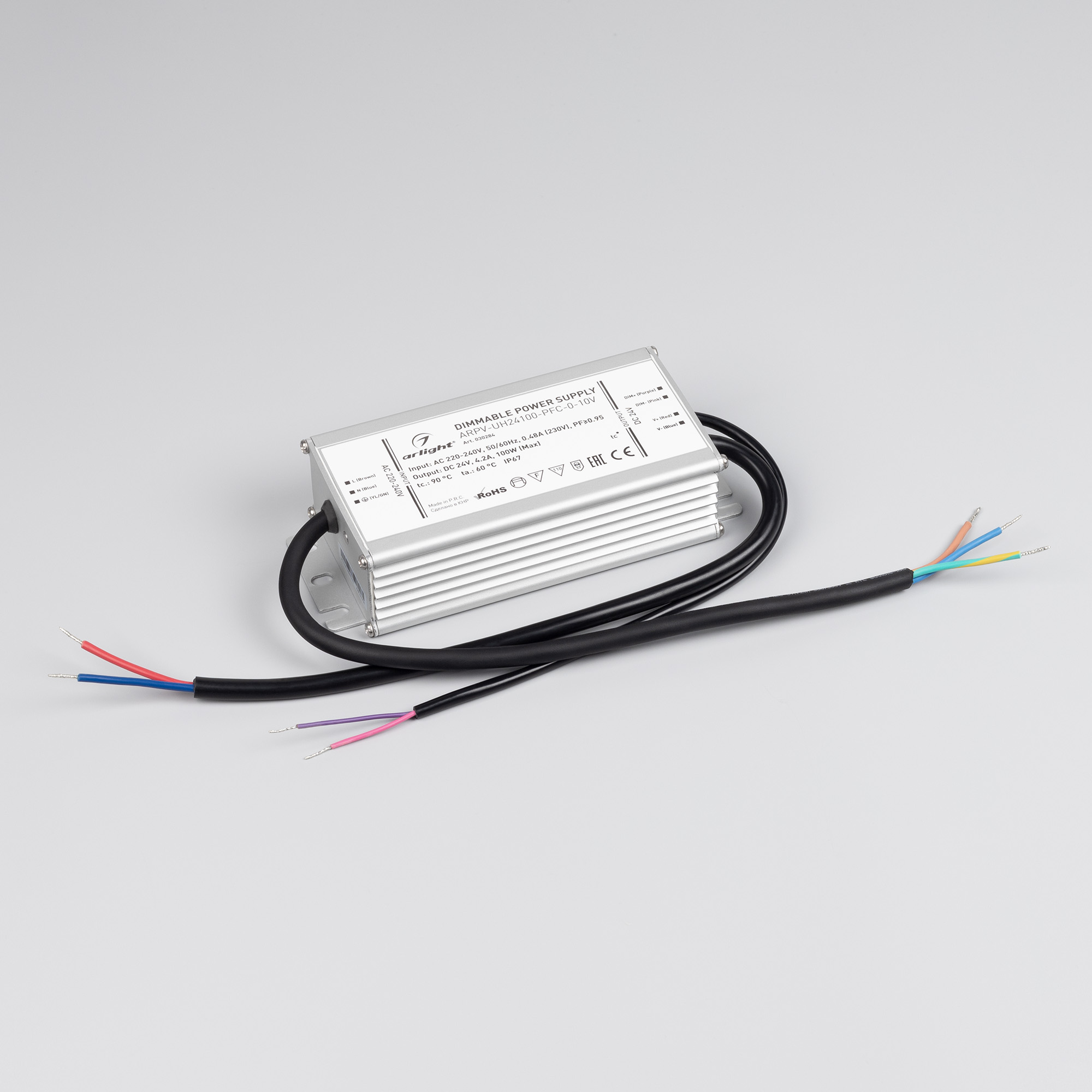 Диммируемый источник напряжения по стандарту 0/1-10 В с гальванической развязкой для светодиодных изделий. Входное напряжение 220-240 VAC. Выходные параметры: 24 В, 4.2 А, 100 Вт. Встроенный PFC >0.95. Герметичный алюминиевый корпус IP 67. Рабочая температура -40…+70C⁰. Габаритные размеры длина 158 мм, ширина 67.5 мм, высота 38.5 мм. Гарантийный срок 7 лет.