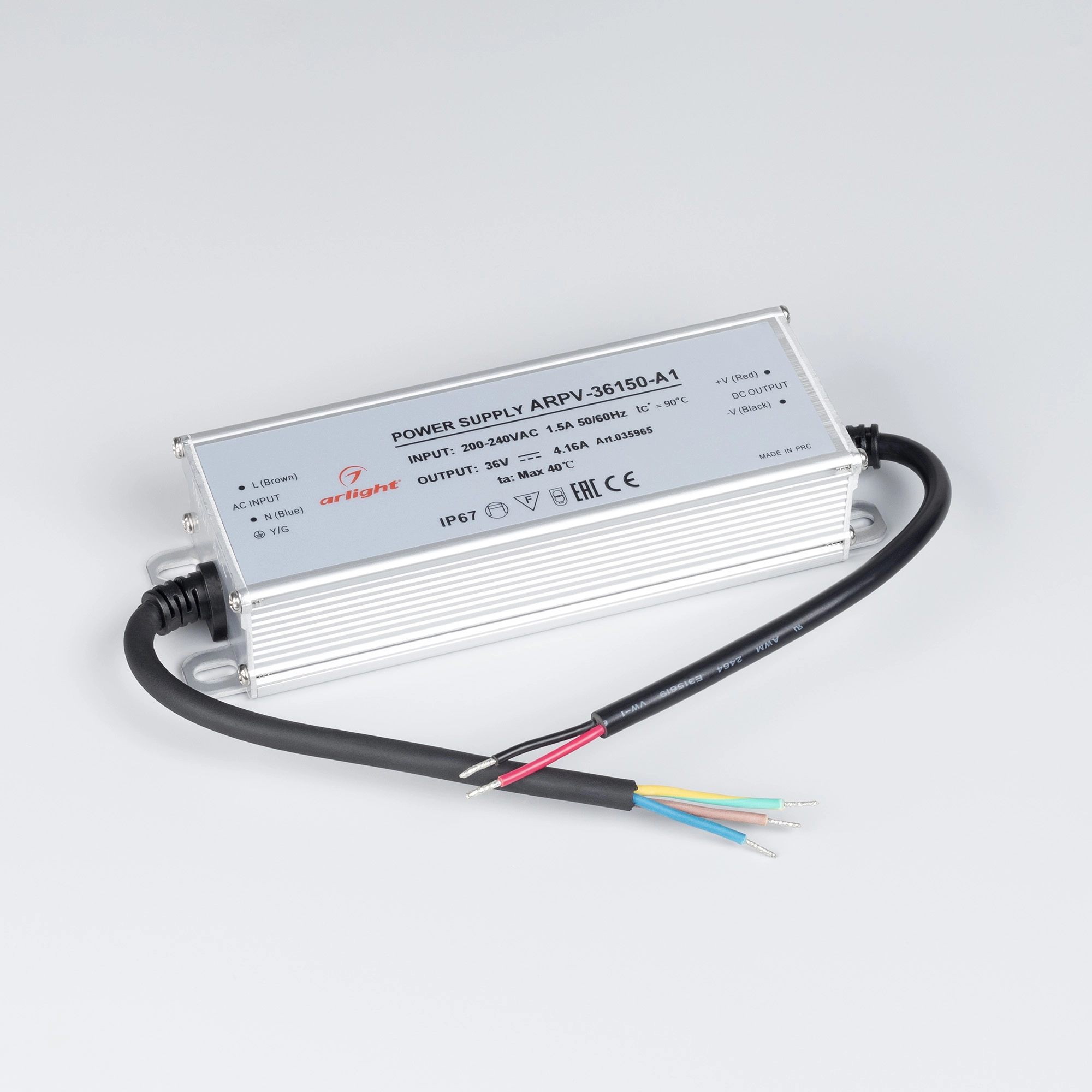 Источник напряжения с гальванической развязкой для светодиодных изделий. Входное напряжение 200-240 VAC. Выходные параметры: 36 В, 4.16 А, 150 Вт. Встроенный PFC >0,5. Герметичный алюминиевый корпус IP 67. Рабочая температура -40…+70C⁰. Габаритные размеры длина 174 мм, ширина 56 мм, высота 36 мм. Гарантийный срок 3 года.