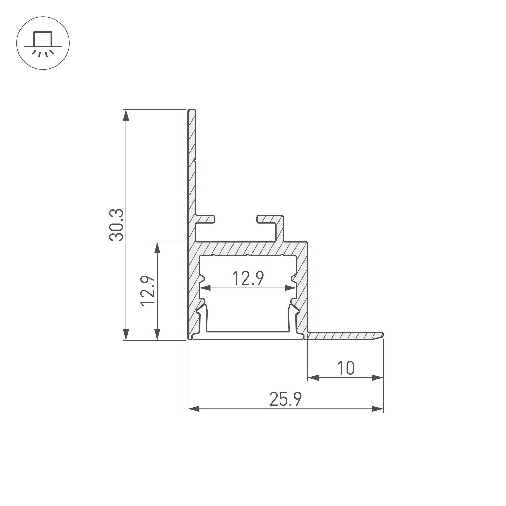 Алюминиевый анодированный встраиваемый профиль для светодиодных лент и линеек. Габаритные размеры (L×W×H): 2000х26х30,3 мм. Ширина площадки для ленты 12,9 мм. Экраны, заглушки и другие аксессуары приобретаются отдельно. Цена за 1 метр.