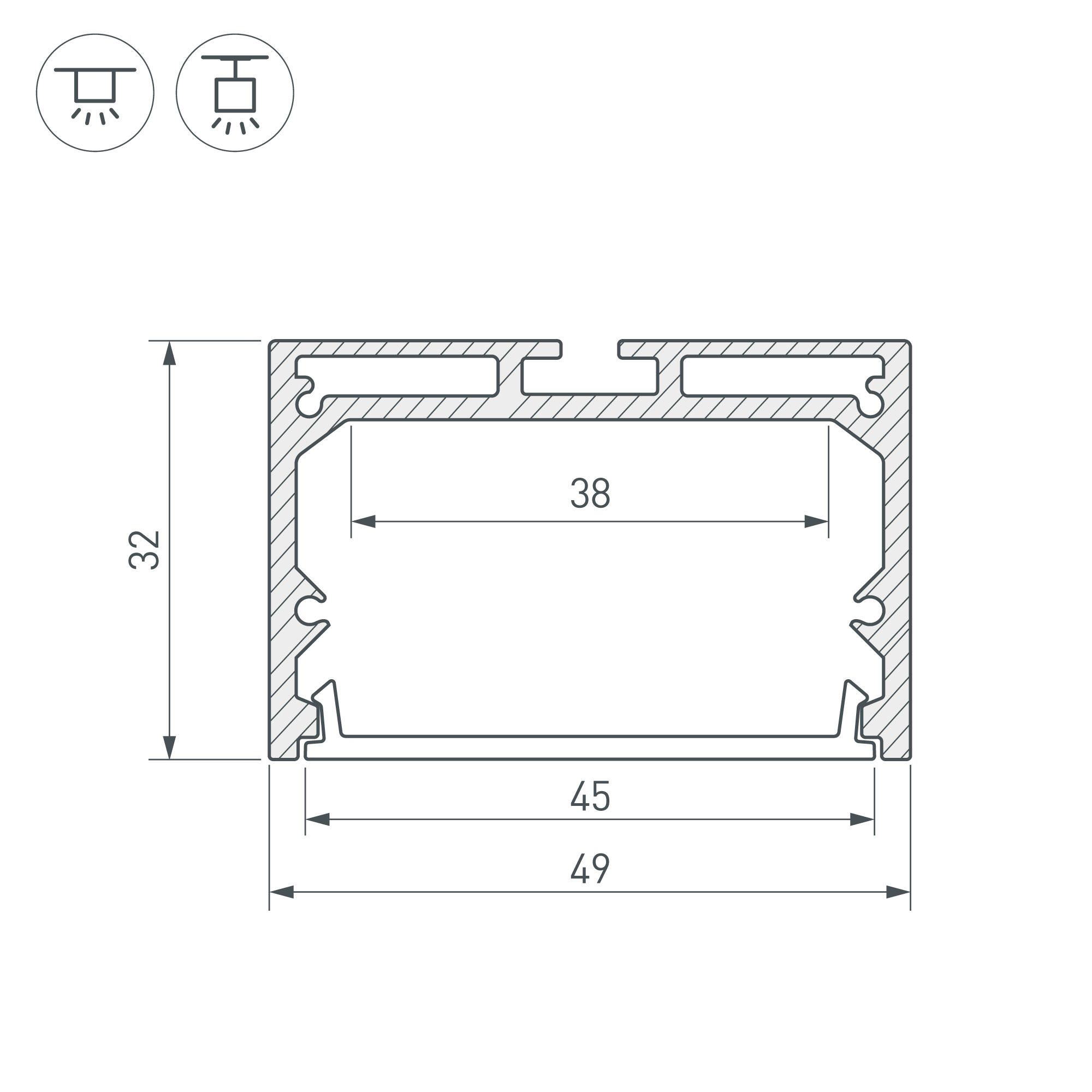 Комплект с экраном. Алюминиевый анодированный профиль для светодиодных лент и линеек. Габаритные размеры (L×W×H): 2500x49x32 мм. Ширина площадки для ленты 38 мм. Аксессуары приобретаются отдельно. Цена за комплект.