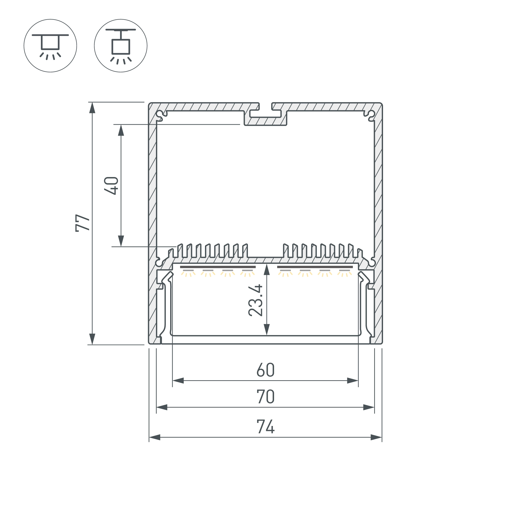 Алюминиевый анодированный профиль для светодиодных лент и линеек. Габаритные размеры (L×W×H): 2000x74x77 мм. Ширина площадки для ленты 60 мм. Отсек для БП 70х40мм. Экраны, заглушки и другие аксессуары приобретаются отдельно. Цена за 1 метр.