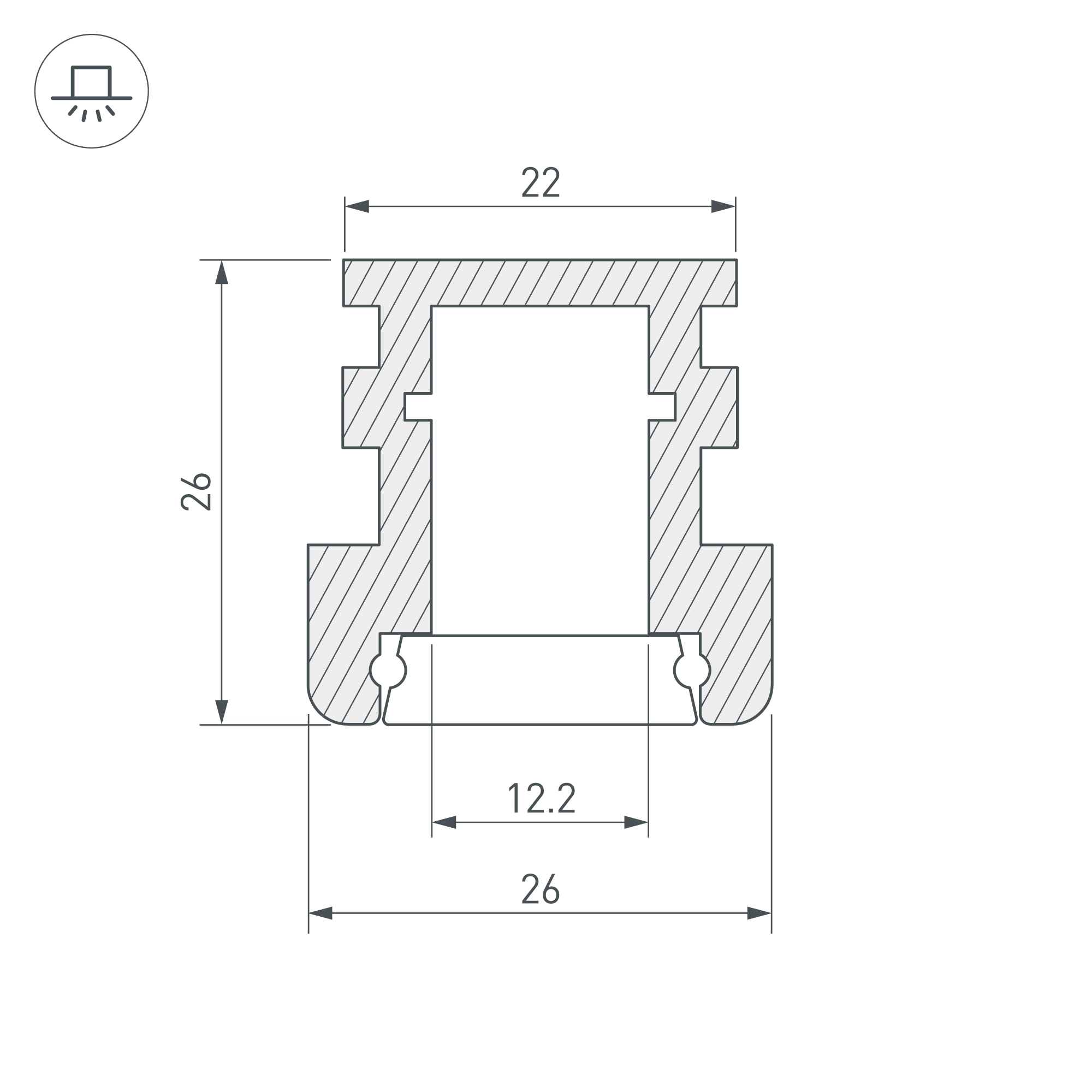 Алюминиевый профиль, встраиваемый в пол. Высокопрочный алюминий (неанодированный). Герметизация до IP67. Может использоваться как внутри помещений, так и снаружи (степень защиты IK10). Габаритные размеры (L×W×H): 2000x26x26 мм. Ширина площадки для ленты 12,2 мм. Экран (из сверхпрочного поликарбоната, УФ-устойчивый), заглушки и другие аксессуары приобретаются отдельно. Цена за 1 метр.
