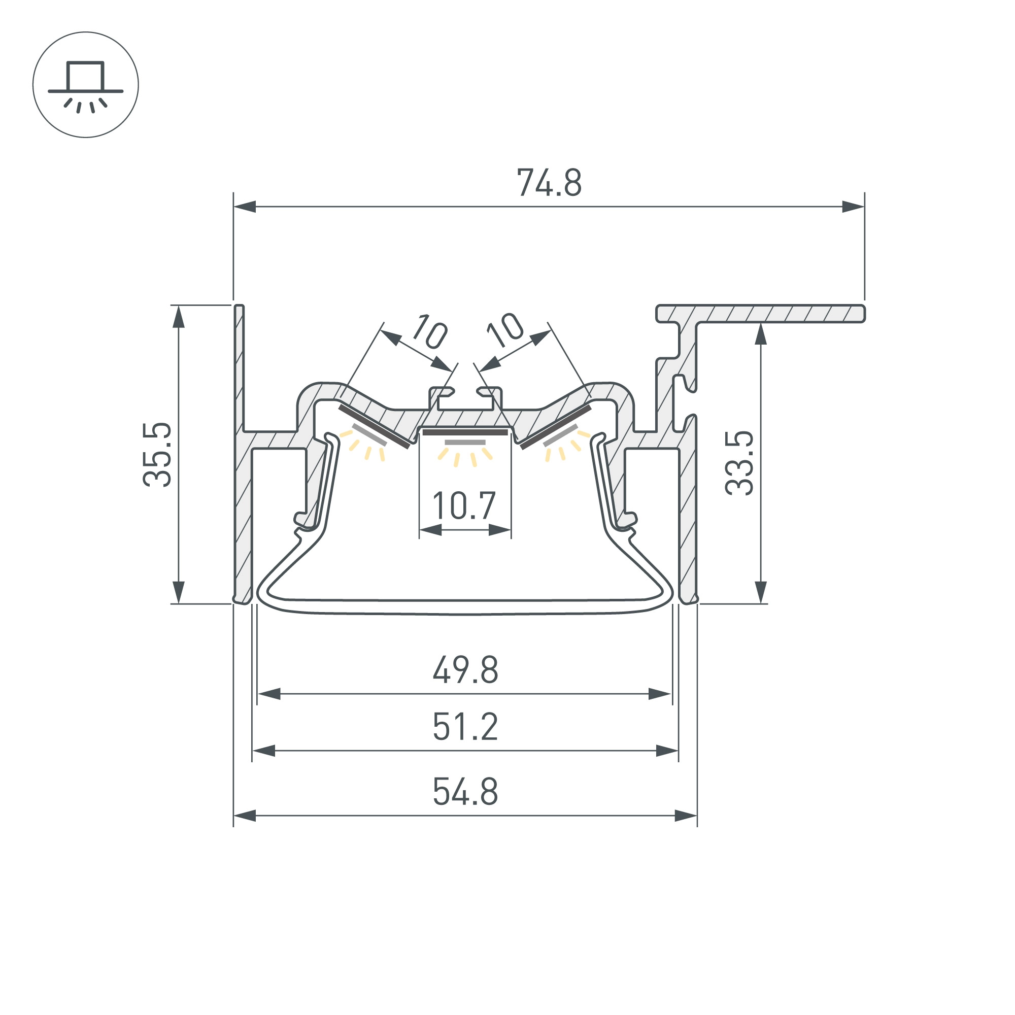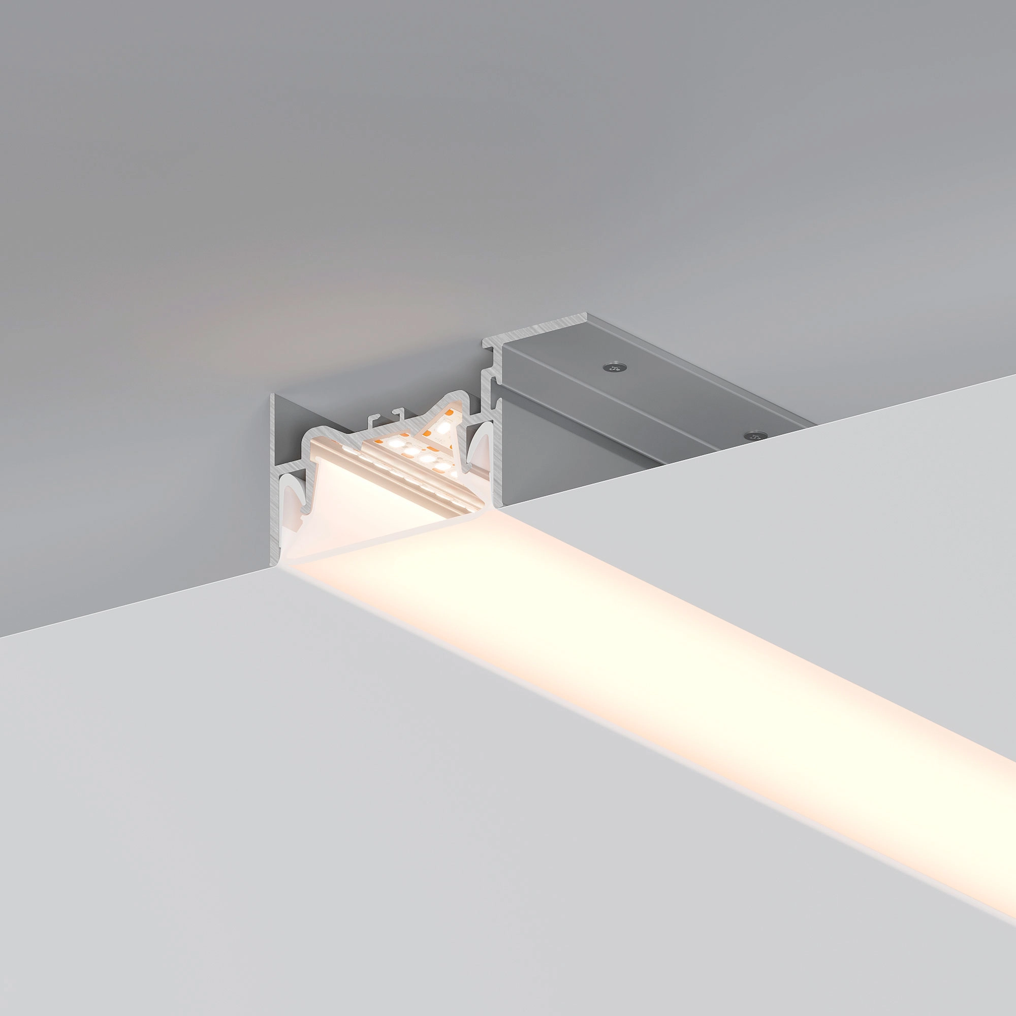 Алюминиевый профиль для натяжных потолков (боковая линия - монтаж к потолку). Решение 2-в-1 - каркас для крепления натяжного потолка и профиль для установки светодиодной ленты. Для дизайнерских решений «линии света» в натяжных потолках. Монтируется к потолку, накладной способ. Натяжной потолок крепится к профилю с одной стороны. Габаритные размеры (L×W×H): 2000x75x36мм. Ширина площадки для ленты 11мм. Экраны, заглушки и другие аксессуары приобретаются отдельно. Цена за 1 метр.