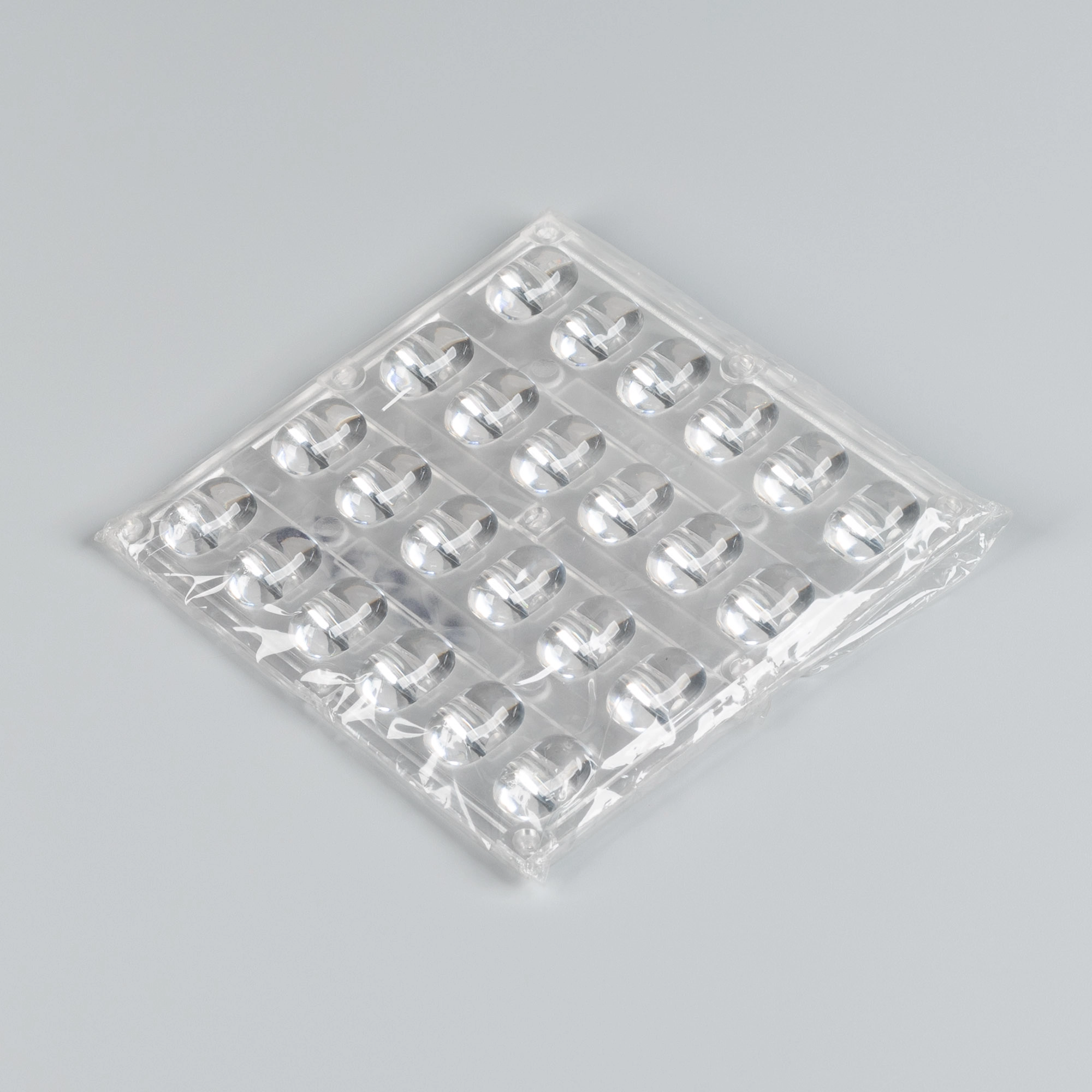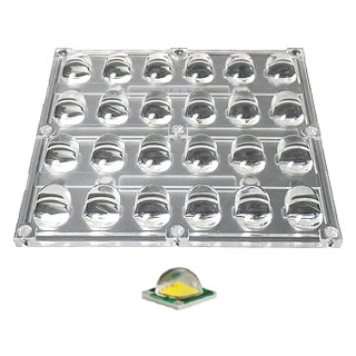 Блочная линза для мощных Emitter, угол обзора: вертикальный 135°, горизонтальный 60°, прозрачная линза. Материал PMMA, количество светодиодов на плате: 24. Длина 120 мм, ширина 120 мм, высота 10.2 мм.