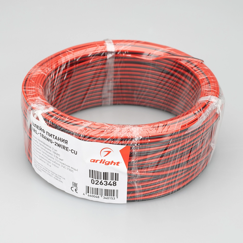 Шлейф для питания и управления одноцветными светодиодными лентами. 2 проводника, калибр проводника 18AWG, сечение проводника 0.84 мм², проводник из луженой меди, внешняя оболочка из ПВХ красного и чёрного цветов. Длина кабеля в бухте — 50 метров.