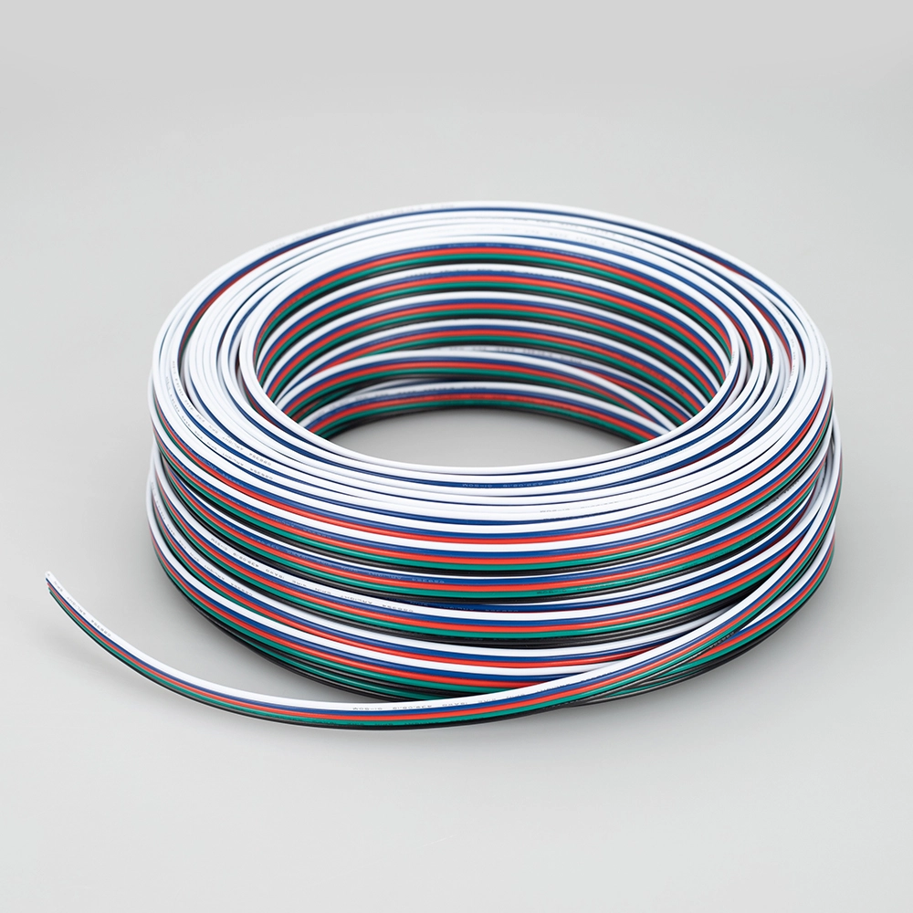 Шлейф для питания и управления мультицветными (RGBW) светодиодными лентами. 5 проводников, калибр проводника 18AWG, сечение проводника 0.84 мм², проводник из луженой меди, внешняя оболочка из ПВХ белого, синего, красного, зелёного и чёрного цветов. Длина кабеля в бухте — 50 метров.
