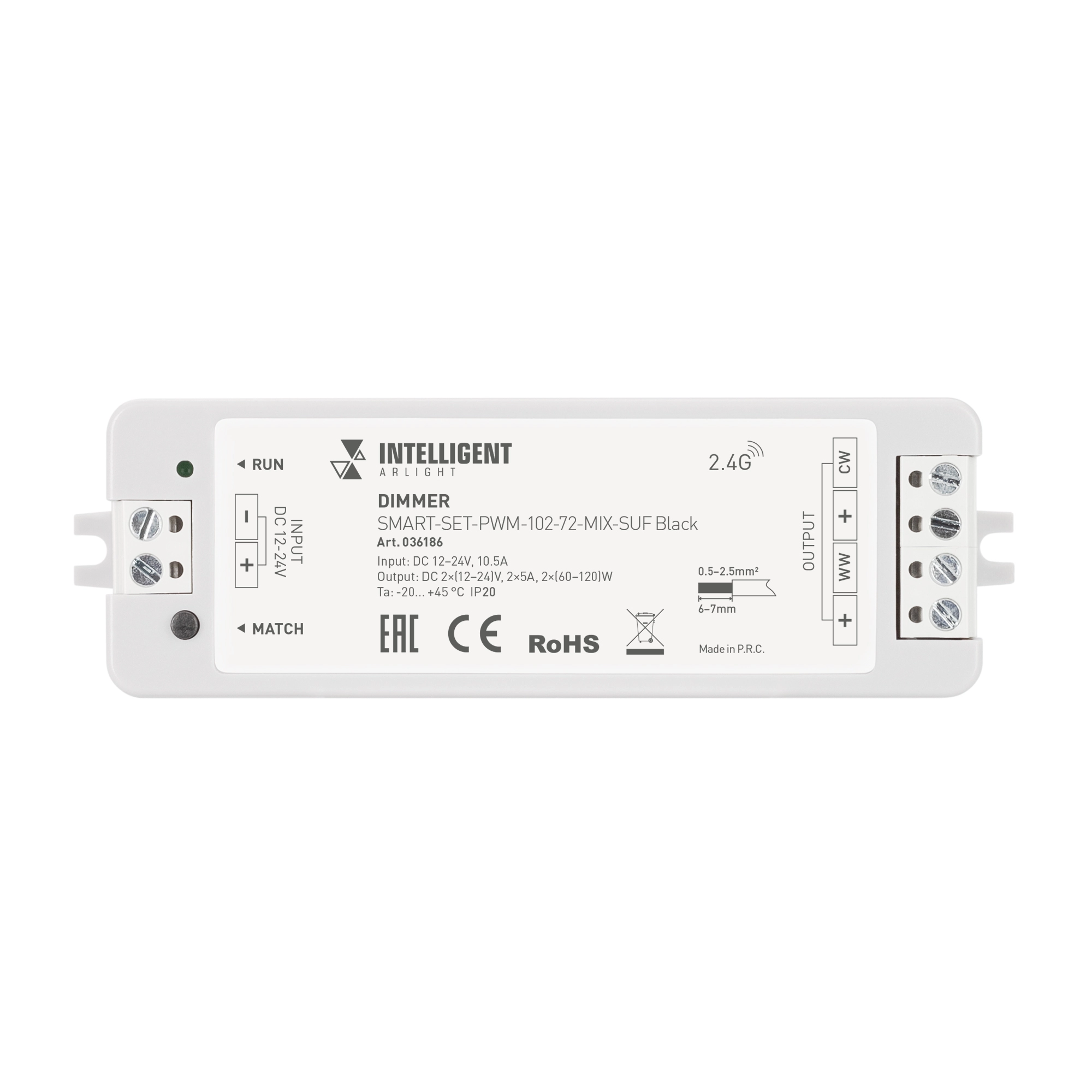 Комплект диммер с пультом для MIX светодиодной ленты (ШИМ). Питание/рабочее напряжение 12-24VDC, максимальный ток 5A на канал, 2 канала, максимальная мощность 120-240W. Габариты контроллера 97x33x18 мм, габариты пульта 139x36x11 мм. Держатель в комплекте.