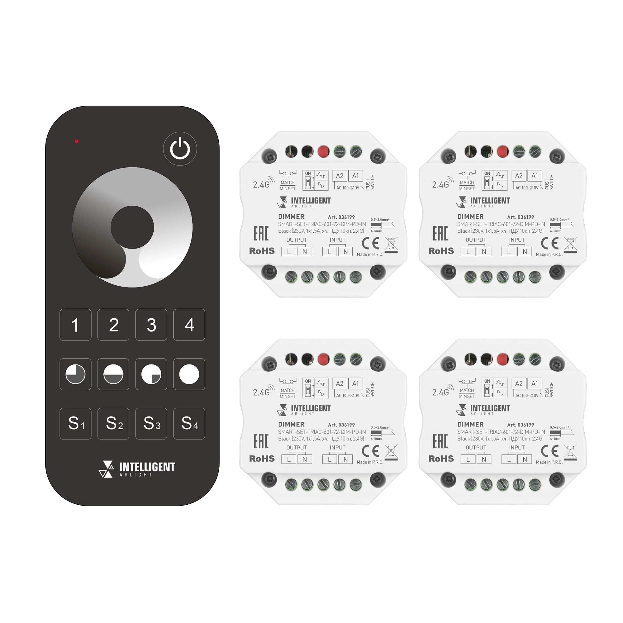 Комплект диммера TRIAC с пультом, предназначенный для установки в подрозетник. В комплекте 4 диммера и 4-зонный пульт с сенсорным кольцом. Питание/рабочее напряжение 100-240VDC, максимальный ток 1.5A на канал, 1 канал, максимальная мощность 150-360W, Push-Dim. Габариты диммера 52x52x26 мм, габариты пульта 122x53x17.5 мм. Держатель в комплекте.