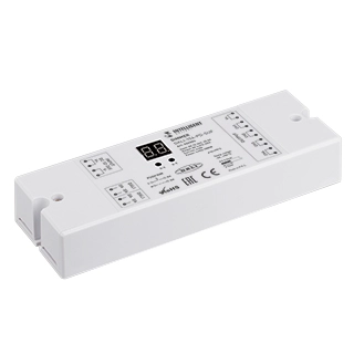 Мощный DALI диммер на 4 адреса, для одноцветных или RGBW светодиодных лент, 4 асинхронных канала. Управляется сигналом DALI или кнопками PUSH DIM. Питание\выход 12-36 VDC. Высокая частота ШИМ 1500Гц. Макс.ток 4x8A. Размеры 168x58x28 мм.