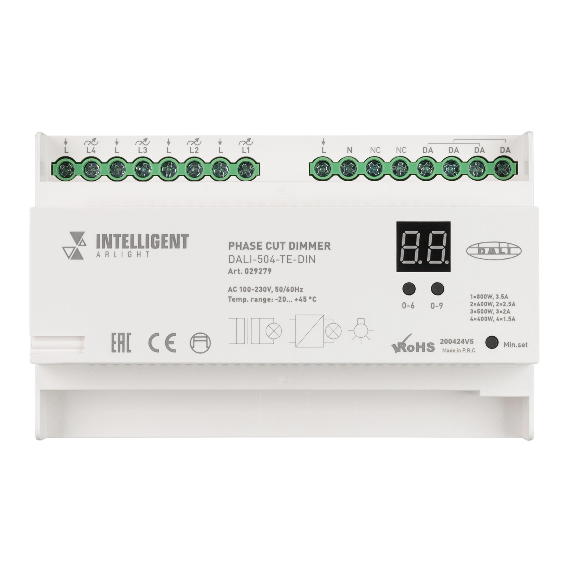 Диммер для управления нагрузкой по 230В (TRIAC/MOSFET), по протоколу DALI. 4 адреса, 4 канала. Максимальная мощность резистивной нагрузки: 4х1.5А или 3х2А или 2х2.5А или 1х3.5А. Диммирование по заднему фронту (Trailing edge), для лучшей совместимости с диммируемыми LED источниками света. Ручная и программная установка адреса. Вход 100-230В, выход 100-230В, ТЕ.