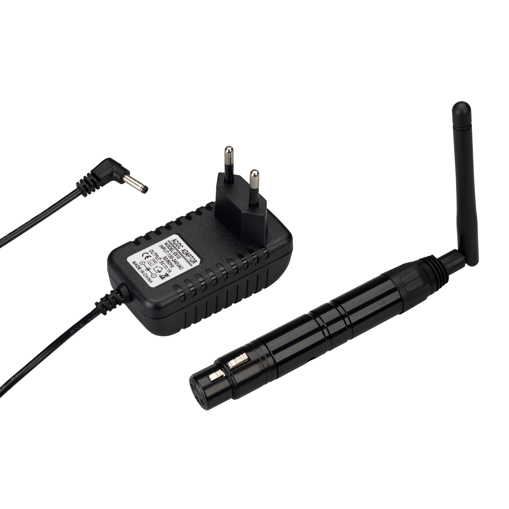 Беспроводной приёмник (усилитель) сигнала DMX512. Вход - радиосигнал 2.4G, выход DMX512. Разъем XLR3 Male, питание DC 5V (укомплектован адаптером). Максимальное расстояние между передатчиком и приёмником сигнала - 400 метров. Габариты 215x21x21 мм. Работает в паре с передатчиком сигнала 028416.