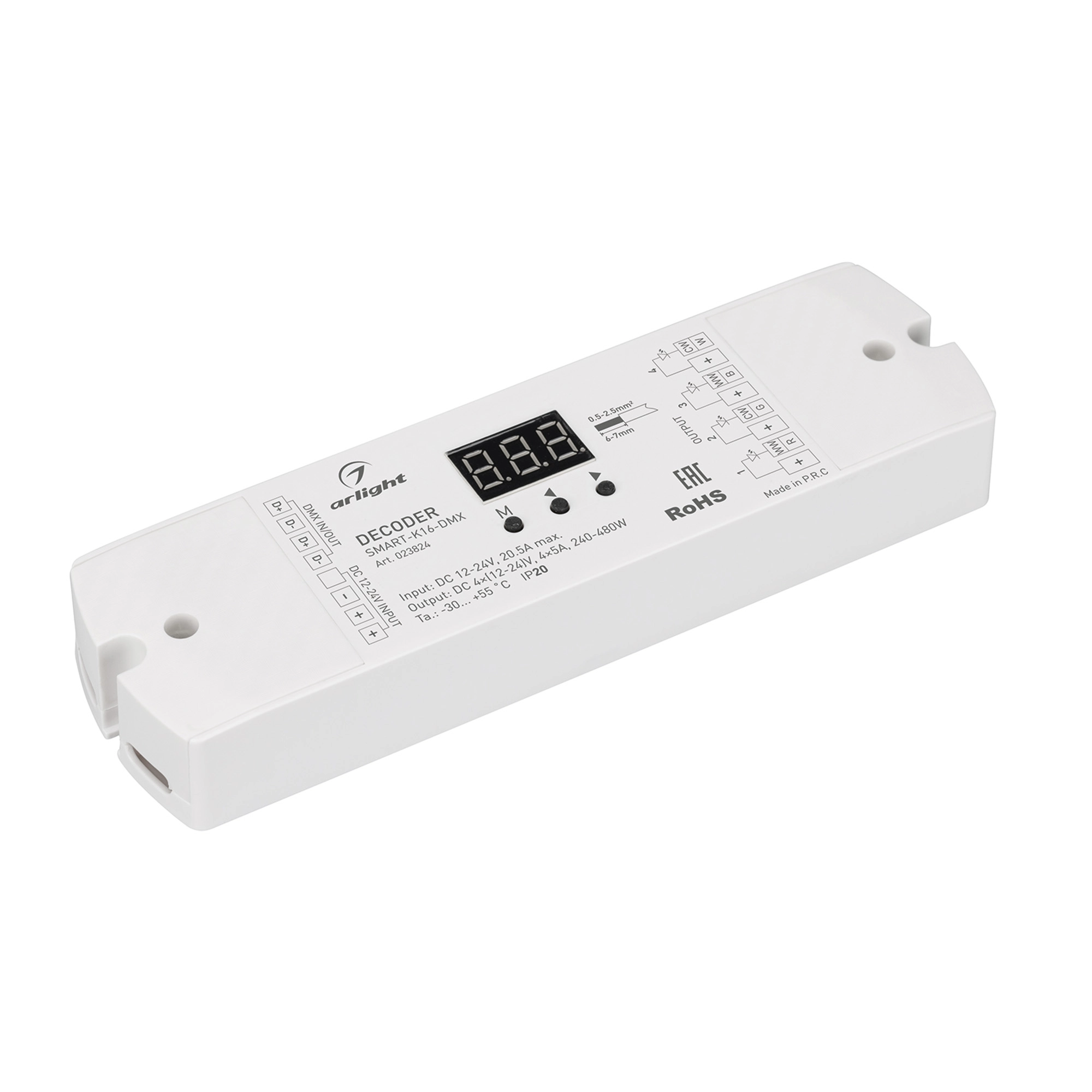 Декодер DMX512 для трансляции DMX512 сигнала ШИМ(PWM) устройствам. Питание 12-24VDC. 4 канала, ток нагрузки 4x5A, мощность нагрузки 240-480W. Входной сигнал DMX512, выходной сигнал ШИМ(PWM). Цифровой дисплей на корпусе, адрес устанавливается с помощью кнопок. Размер 170x50x23 мм.