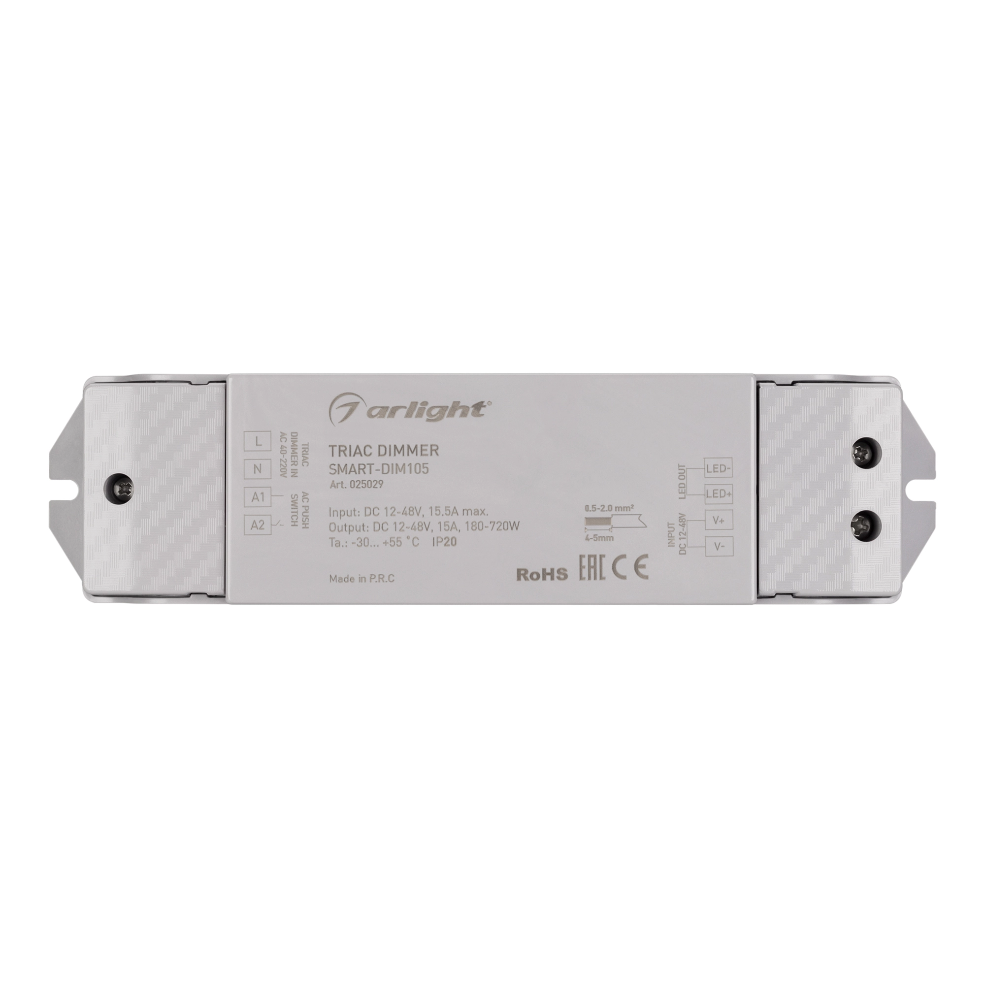 Диммер TRIAC для светодиодных лент. Сигнал управления TRIAC 100-240VAC, питание/рабочее напряжение 12-48VDC, максимальный ток 15A, максимальная мощность 180-720W. Винтовые клеммы. Корпус - PVC. Габариты 175x45x27 мм. Управляется стандартными светорегуляторами TRIAC по переднему фронту (LE).