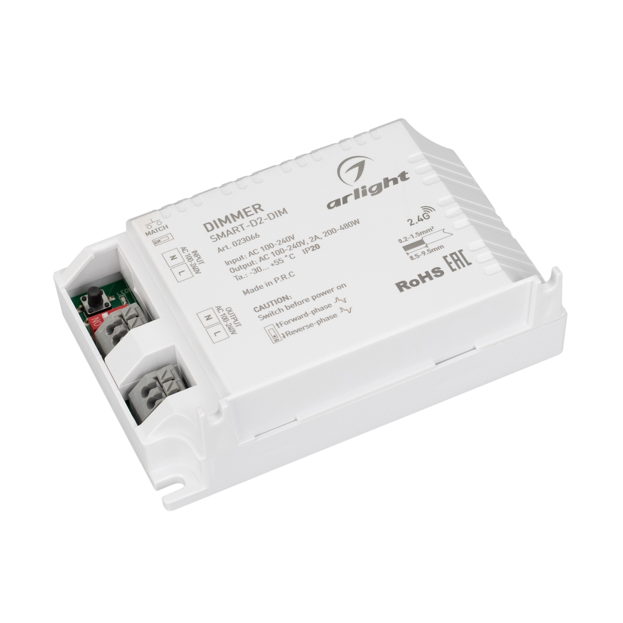 Диммер для одноцветных источников света (TRIAC). Питание/рабочее напряжение 100-240VDC, выходной ток 2А, выходная мощность 200-480W. Корпус - PVC. Габариты 103х67х30 мм. Управляется пультами и панелями серии SMART, поддерживающими диммирование по радиоканалу (см. совместимые).