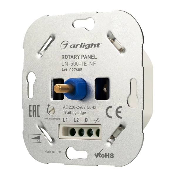 Встраиваемая роторная панель. Для управления одноцветными источниками света (TRIAC). Управление яркостью с помощью роторного вращателя. Работает в режиме Trailing Edge, диммирование по заднему фронту. Не требует подключения N провода. Возможна работа с любым источником света, поддерживающим фазное диммирование. Есть регулировка ограничения минимального уровня яркости. Питание/рабочее напряжение 220-240VAC. Максимальная резистивная нагрузка 500W, минимальная- 5W. Габариты 70х70х47 мм., Декоративная накладка в комплект не входит. Панель совместима с проходными выключателями. Механизм совместим с большинством европейских производителей электроустановочных изделий.