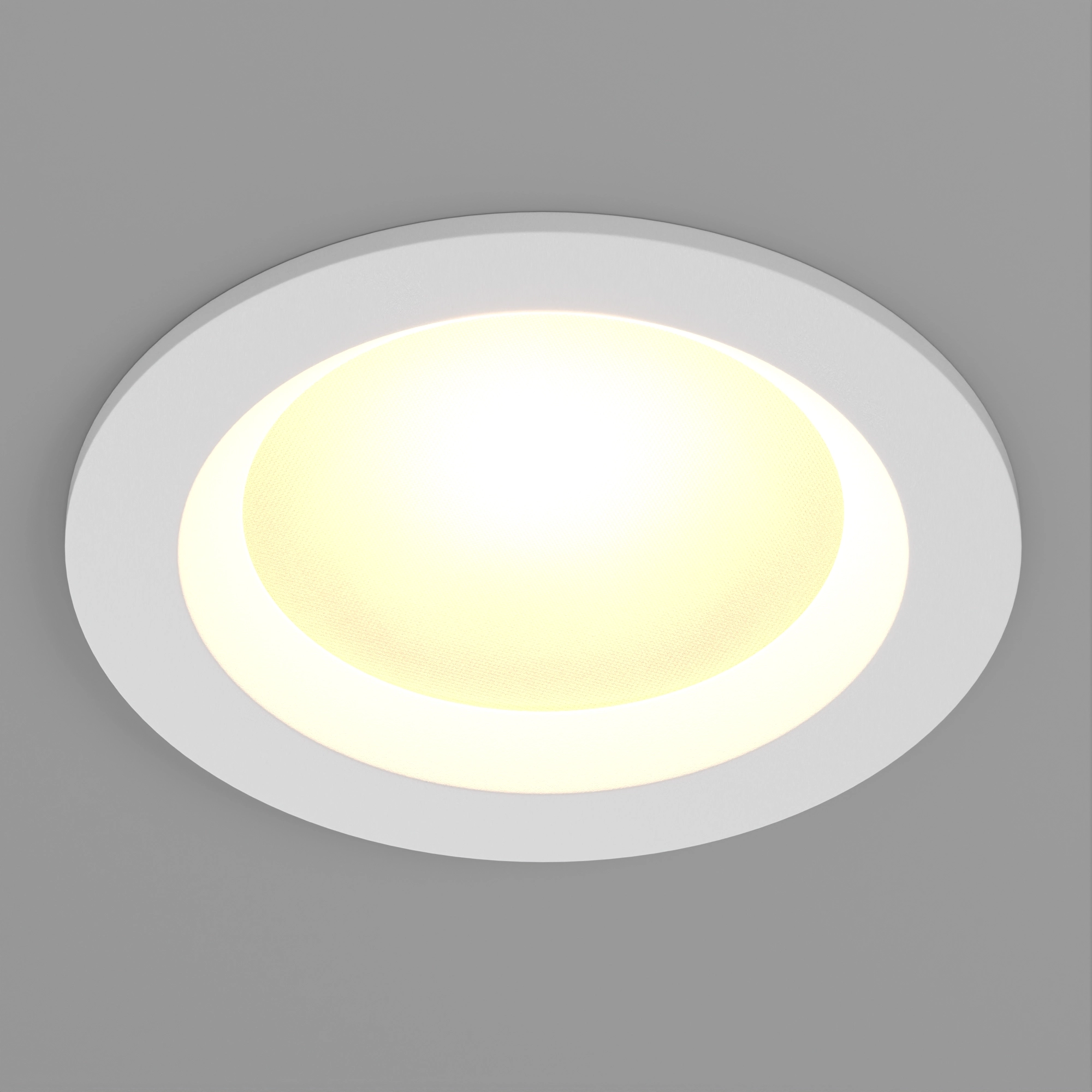 Корпус выполнен из алюминия с белым покрытием, что придаёт современный вид. Экран из PMMA обеспечивает защиту от внешних воздействий, а степень защиты IP54 гарантирует влагозащищенность, что позволяет использовать светильник в помещениях с повышенной влажностью. Размеры светильника: диаметр 145 мм и высота 55 мм, что делает его компактным и удобным для встраивания в потолок с установочным отверстием диаметром 130 мм.
