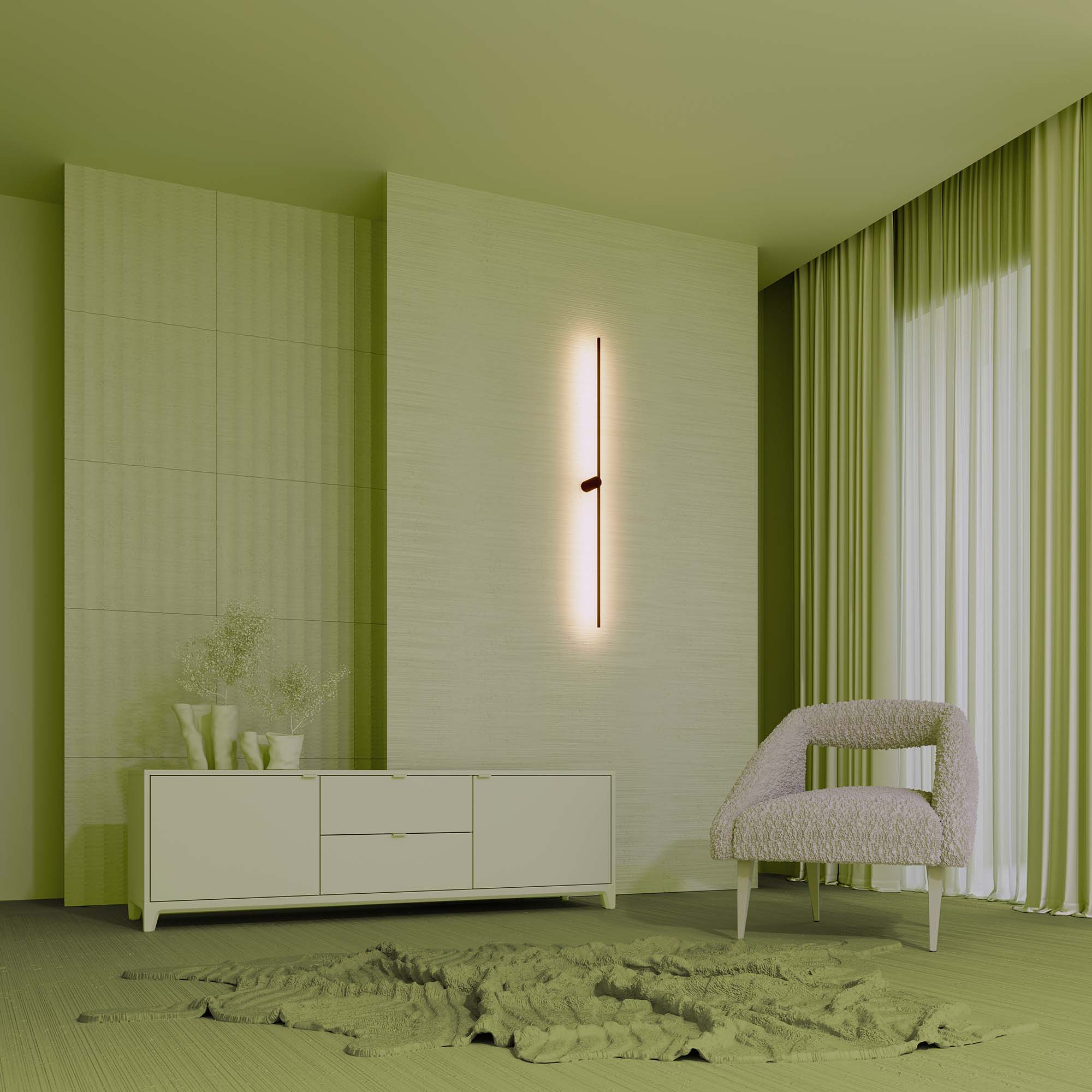 Декоративный настенный поворотный светильник с креплением в центре корпуса. Мощность 12 Вт, св. поток 400 лм, 37 лм/Вт, дневной 4000 K, CRI>80, угол 110°, напряжение питания 230 В. Черный фигурный корпус из алюминия, экран из поликарбоната , степень защиты IP20. Размер: длина 1250 мм, ширина 55 мм, высота 102 мм. Монтаж накладной. Драйвер 5-12 В, 700 мА, пульсация <0,5%. Возможность поворота светоизлучателя на 355 градусов.