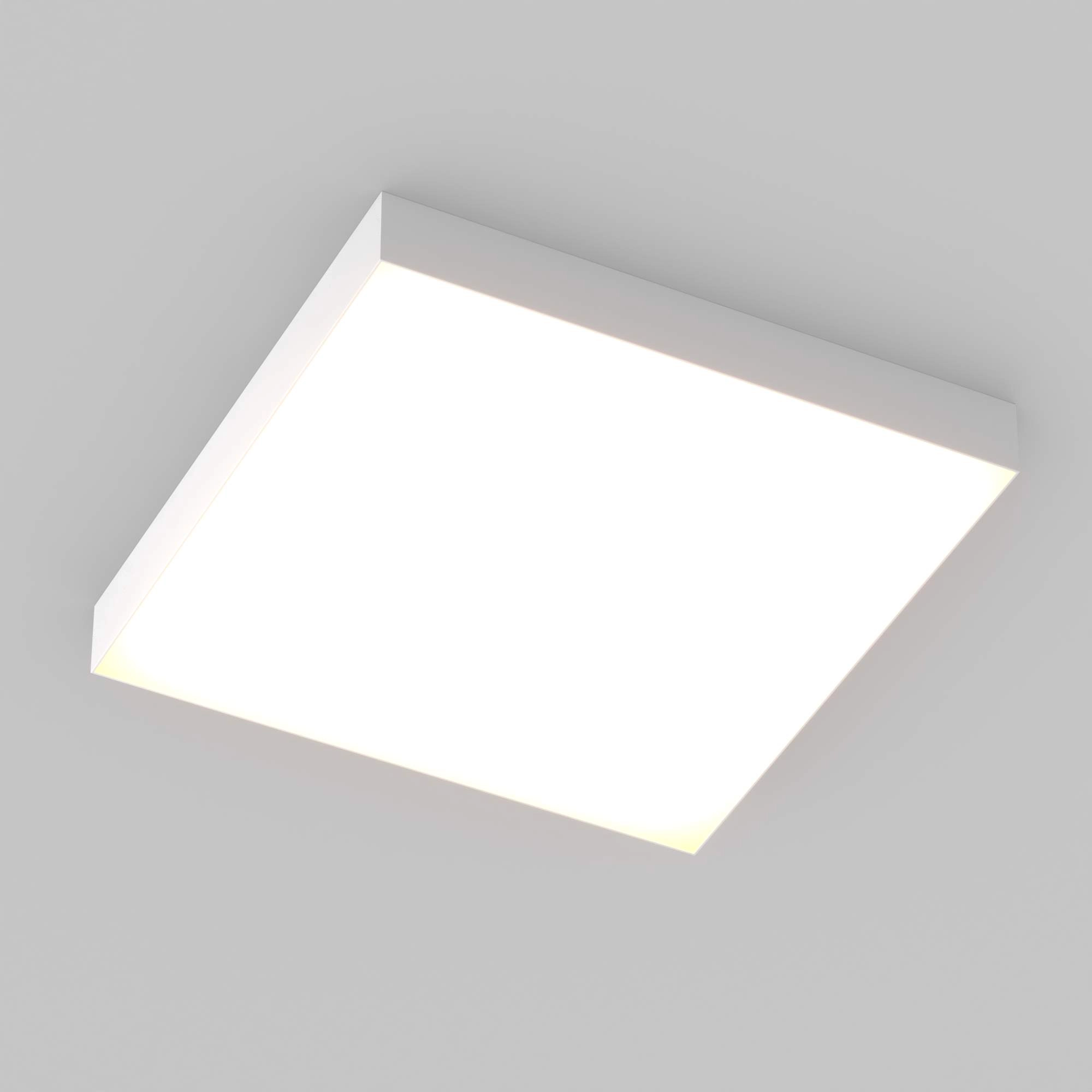 Накладной светильник. Мощность 50 Вт, св. поток 4100-4400 лм, 80-90 лм/Вт, дневной 4000 K, CRI>90, угол 120°, напряжение питания 230 В. Белый квадратный корпус из алюминия, экран PC, степень защиты IP40. Размер: длина 500 мм, ширина 500 мм, высота 64 мм. Монтаж накладной. Драйвер 27-42 В, 1200 мА, пульсация <5%.