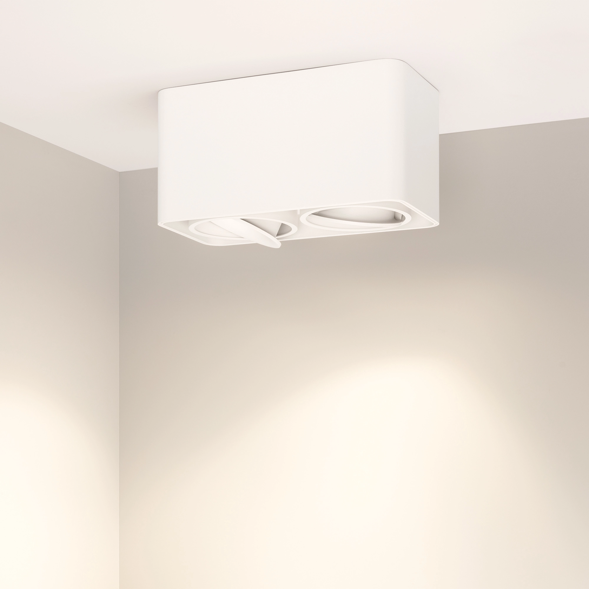 Накладной интерьерный светильник. Мощность 16 Вт, св. поток 1490 лм, 98 лм/Вт, теплый 3000 K, CRI>90, угол 45°, регулируемое направление луча 30°, напряжение питания 230 В. Белый квадратный корпус из алюминия, степень защиты IP20. Размер: длина 195 мм, ширина 100 мм, высота 100 мм. Монтаж накладной. Драйвер 26-40 В, 400 мА, пульсация <5%.