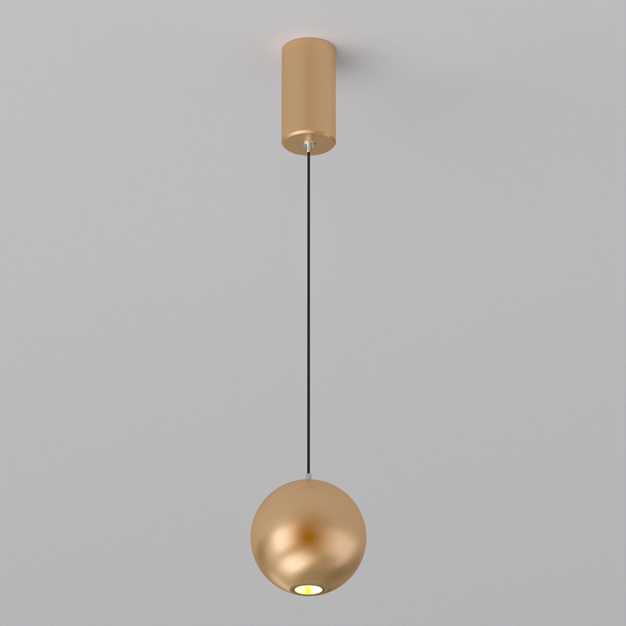 Подвесной светильник. Мощность 9 Вт, св. поток 650 лм, 73 лм/Вт, теплый 3000 K, CRI>80, угол 39°, напряжение питания 230 В. Золотой круглый корпус из алюминия, экран , степень защиты IP40. Размер: диаметр 100 мм, высота 97 мм. Монтаж подвесной, длина подвеса 1500мм, регулируемая. Габариты чаши Ø50x95 мм. Драйвер 28-42 В, 250 мА, пульсация <5%.