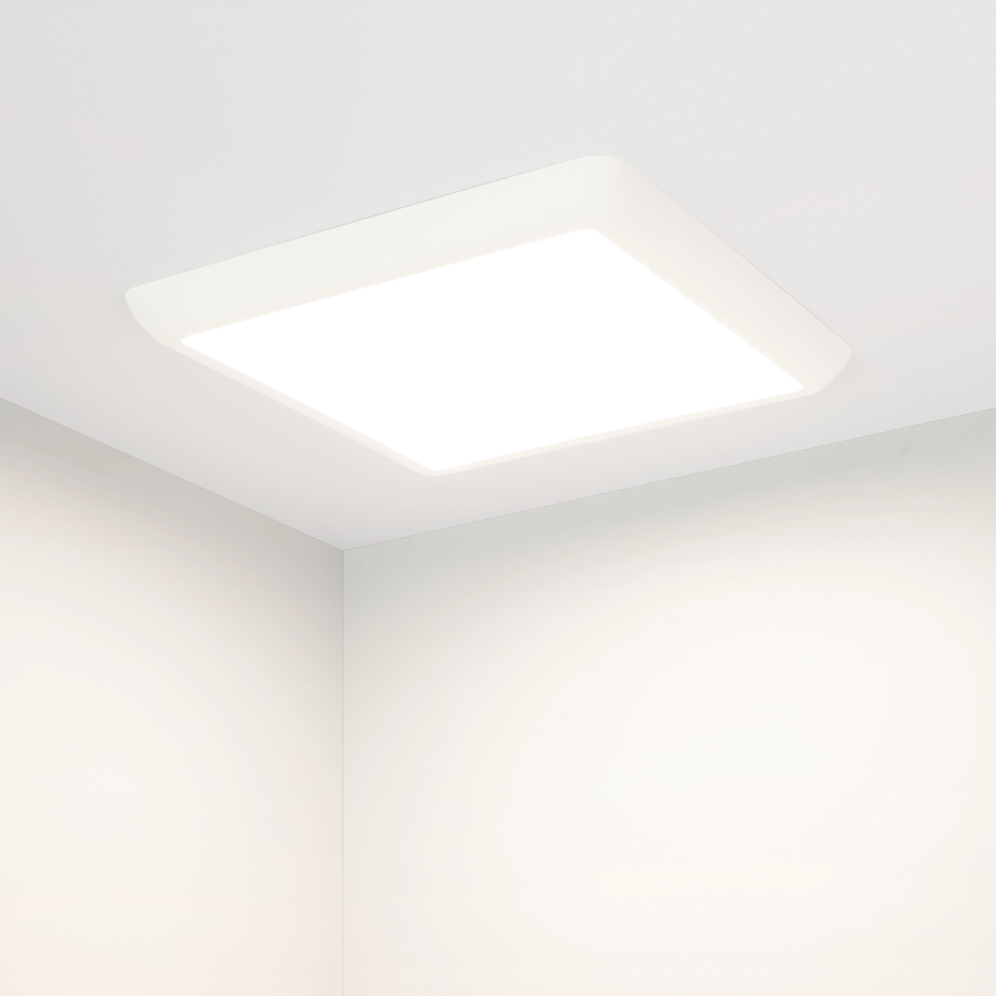 Накладной/встраиваемый светильник с изменяемой мощностью и цветовой температурой. Мощность 18-25 Вт, св. поток 1600-2300 лм, 75-90 лм/Вт, теплый 3000 K, дневной 4000K, белый 6000K, CRI>80, угол 120°, напряжение питания 230 В. Белый квадратный корпус из пластика, экран поликарбонат, степень защиты IP44. Размер: длина 300 мм, ширина 300 мм, высота 25 мм. Монтаж накладной/встраиваемый, установочное отверстие: диаметр 150-270 мм (регулируемое). Драйвер встроенный, пульсация <1%. Комплект крепежа поставляется отдельно, необходимо 2 комплекта.