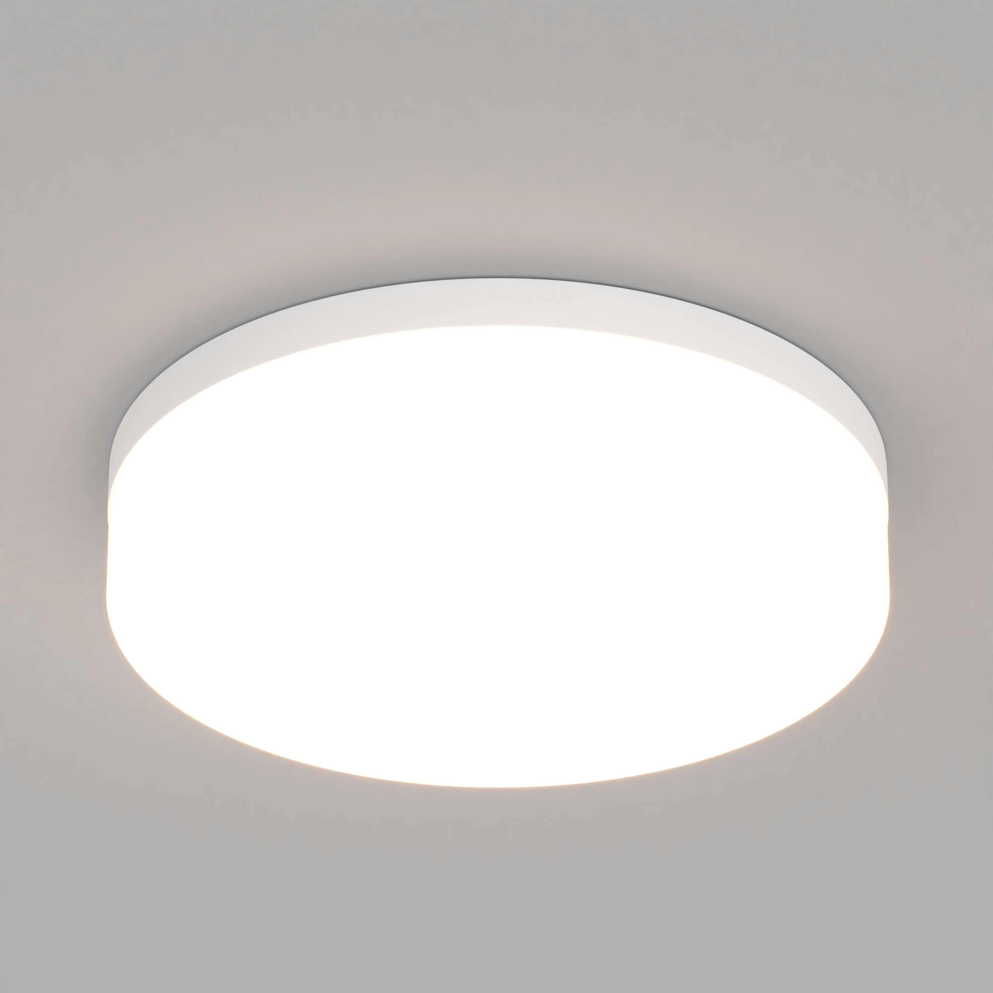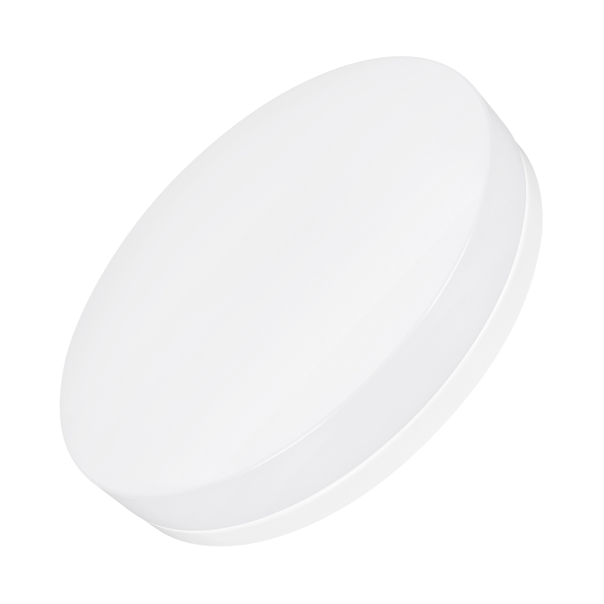 Накладной светильник с изменяемой цветовой температурой. Мощность 30 Вт, св. поток 2400-2900 лм, 100 лм/Вт, теплый 3000 K, дневной 4000K, белый 6000K, CRI>80, угол 140°, напряжение питания 230 В. Белый круглый корпус из металла, рассеиватель из поликарбоната, степень защиты IP40. Размер: диаметр 397 мм, высота 83 мм. Монтаж накладной, Драйвер встроенный, пульсация <1%.