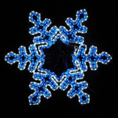 Снежинка выполнена из дюралайта светодиодов синего и белого тона, которые закреплены на каркасе из металла. Украшение полностью готово к применению, требуется лишь закрепить его и включить. В комплекте поставляется контролер, позволяющий выбирать один из восьми предлагаемых режимов работы. Фигурки защищены от воздействия мороза и влаги. Идеальное решение для праздничного декорирования ели, витрин, фасадов строений зимой и летом. Изделия великолепны в эксплуатации и в помещении, и за его пределами.