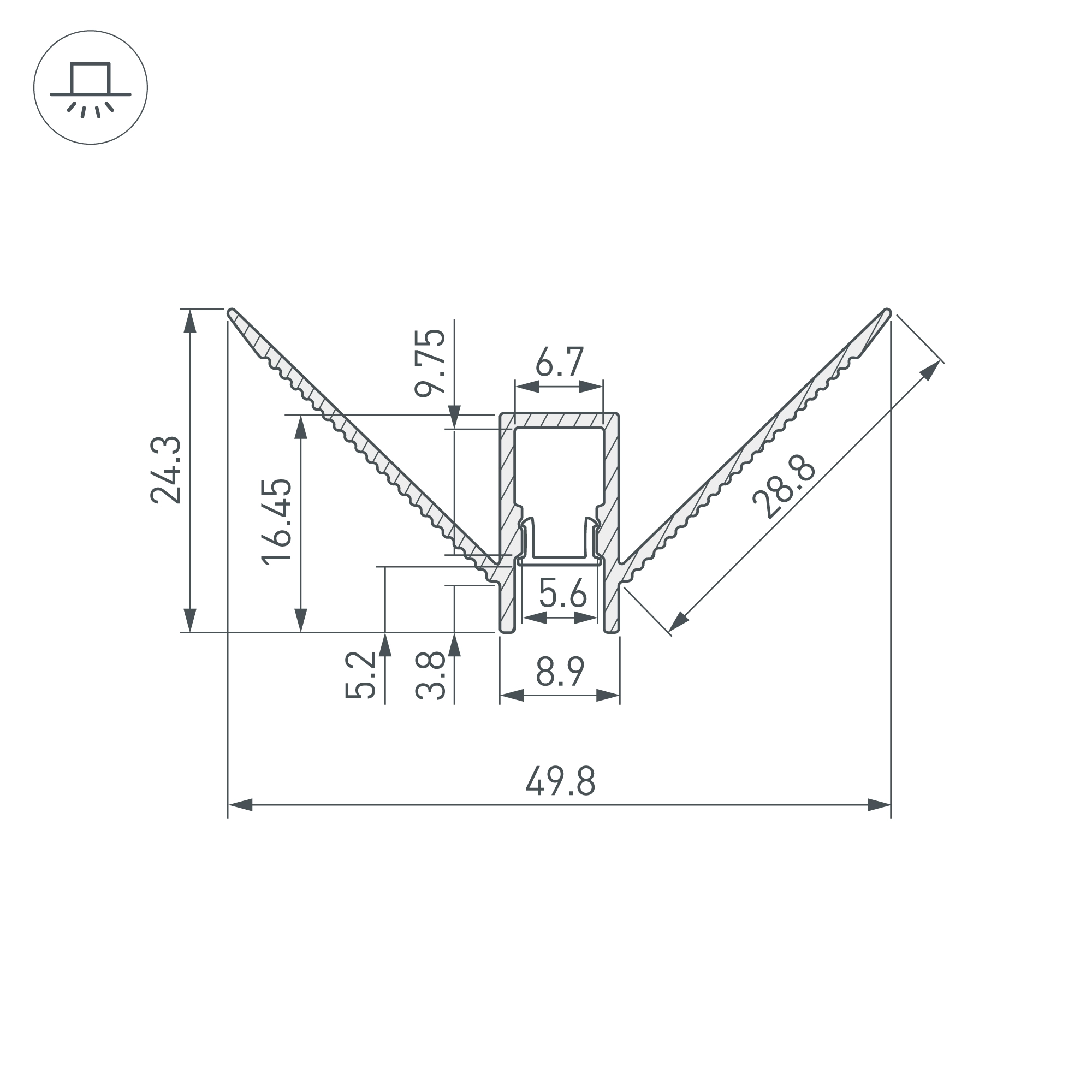 Алюминиевый анодированный угловой профиль для светодиодных лент и линеек, под строительную отделку. Фиксируется при помощи строительной смеси. Декоративная контурная подсветка внешних углов стен и конструкций. Габаритные размеры (L×W×H): 2000x49,8x24,3 мм. Ширина площадки для ленты 6,7 мм. Экраны, заглушки и другие аксессуары приобретаются отдельно. Цена за 1 метр.