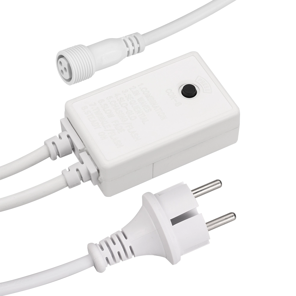 Контроллер для светодиодных гирлянд с эффектом динамики. Материал оболочки РЕЗИНА (каучук). Цвет провода белый. В комплект входит: провод питания с вилкой европейского стандарта (IP44), 3pin разъём подключения к гирлянде, выпрямитель AC/DC (1.6A), контроллер для смены режимов динамического свечения (8 режимов). Длина провода 1.5 метра.
