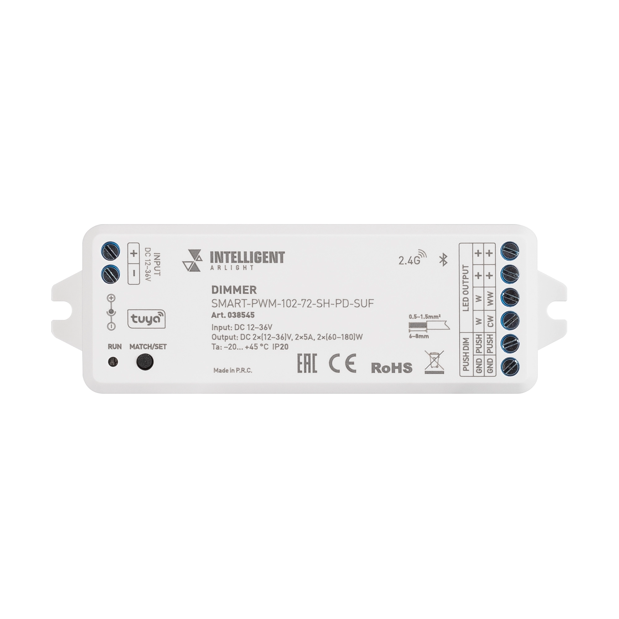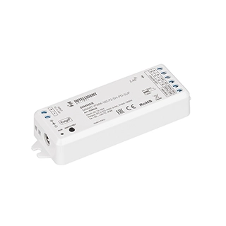 Многофункциональный 2-канальный контроллер для светодиодных DIM и MIX лент и модулей (ШИМ), управляемый по 2.4G+Bluetooth (SIG MESH), интерфейс TUYA, совместим с приложением INTELLIGENT ARLIGHT. Питание/рабочее напряжение 12-36VDC, максимальный ток 5A на канал, 2 канала, максимальная мощность 120-360W. Винтовые клеммы. Корпус - PVC. Габариты 114x38x20 мм. Совместим с пультами и панелями SMART.