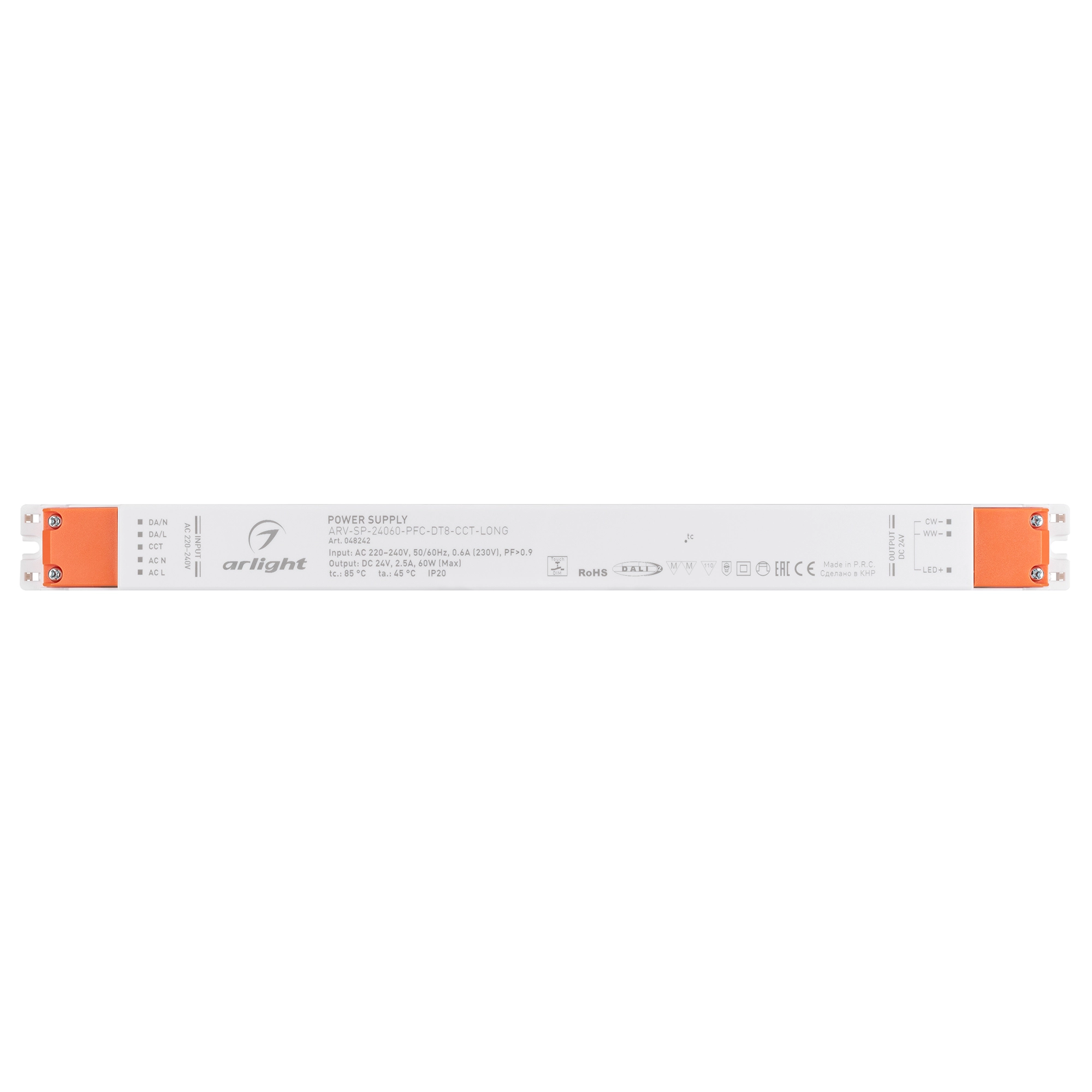Источник напряжения с возможностью диммирования и регулировки цветовой температуры по протоколу DALI2 DT8 с гальванической развязкой для MIX (CCT) светодиодных лент. Встроены функции PUSH DIM, PUSH CCT. Входное напряжение 220-240 VAC. Выходные параметры: 24 В, 2.5А (максимальный суммарный ток на два канала), 60 Вт. Встроенный PFC >0.9. Негерметичный пластиковый корпус IP 20. Габаритные размеры длина 361.5 мм, ширина 30 мм, высота 21.3 мм. Гарантийный срок 5 года.