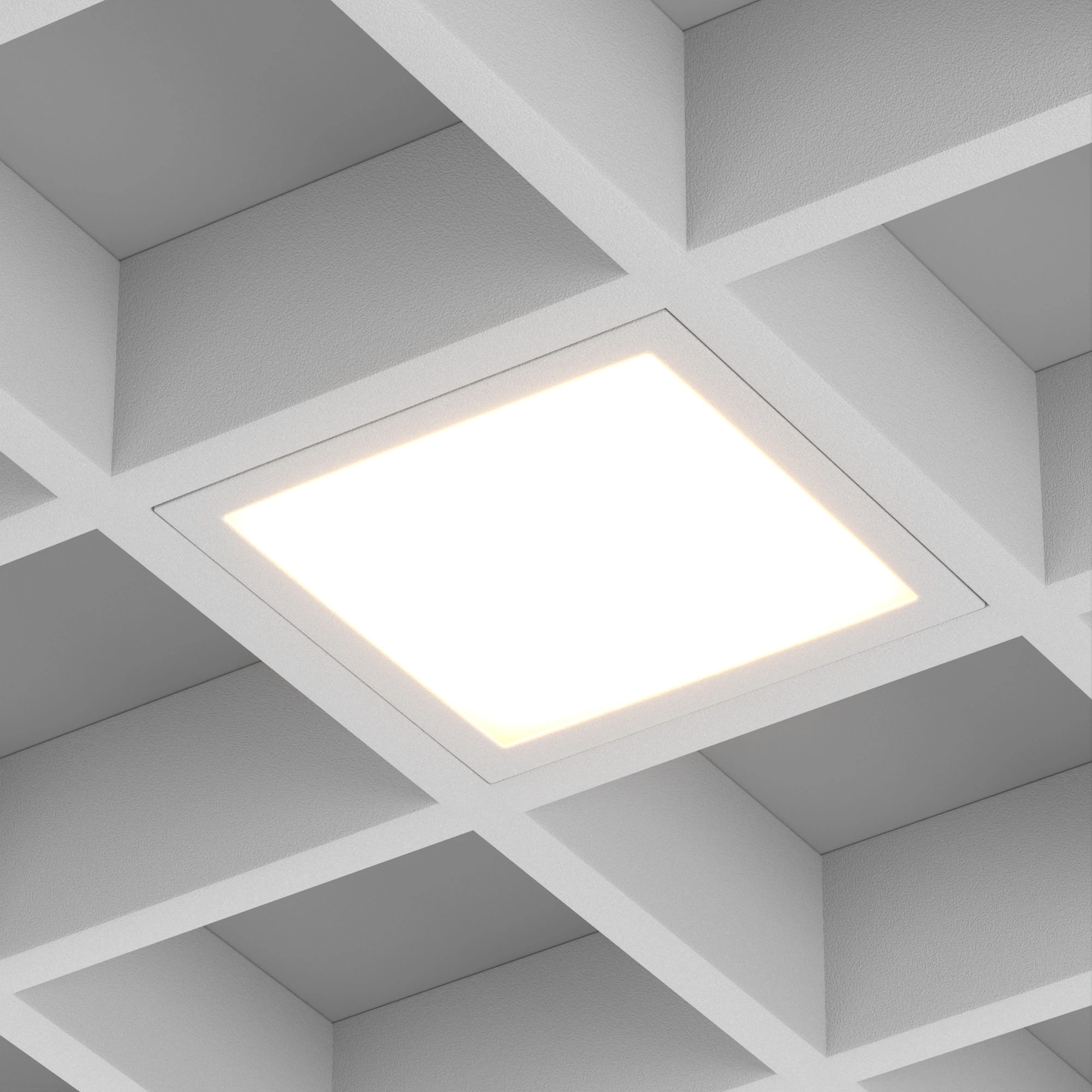 Встраиваемый светильник даунлайт для установки в потолки Грильято с размером ячейки 100х100 мм и высотой направляющих 30, 40 или 50 мм. Мощность 12 Вт, св. поток 1210 лм, 101 лм/Вт, тёплый 3000 K, CRI>90, угол 90°, напряжение питания 230 В. Серый квадратный корпус из алюминия (RAL 7045), степень защиты IP40. Размер: длина 90 мм, ширина 90 мм, высота 40 мм. Монтаж встраиваемый, установочное отверстие: длина 90 мм, ширина 90 мм. Драйвер 24-42 В, 300 мА, пульсация <2%.