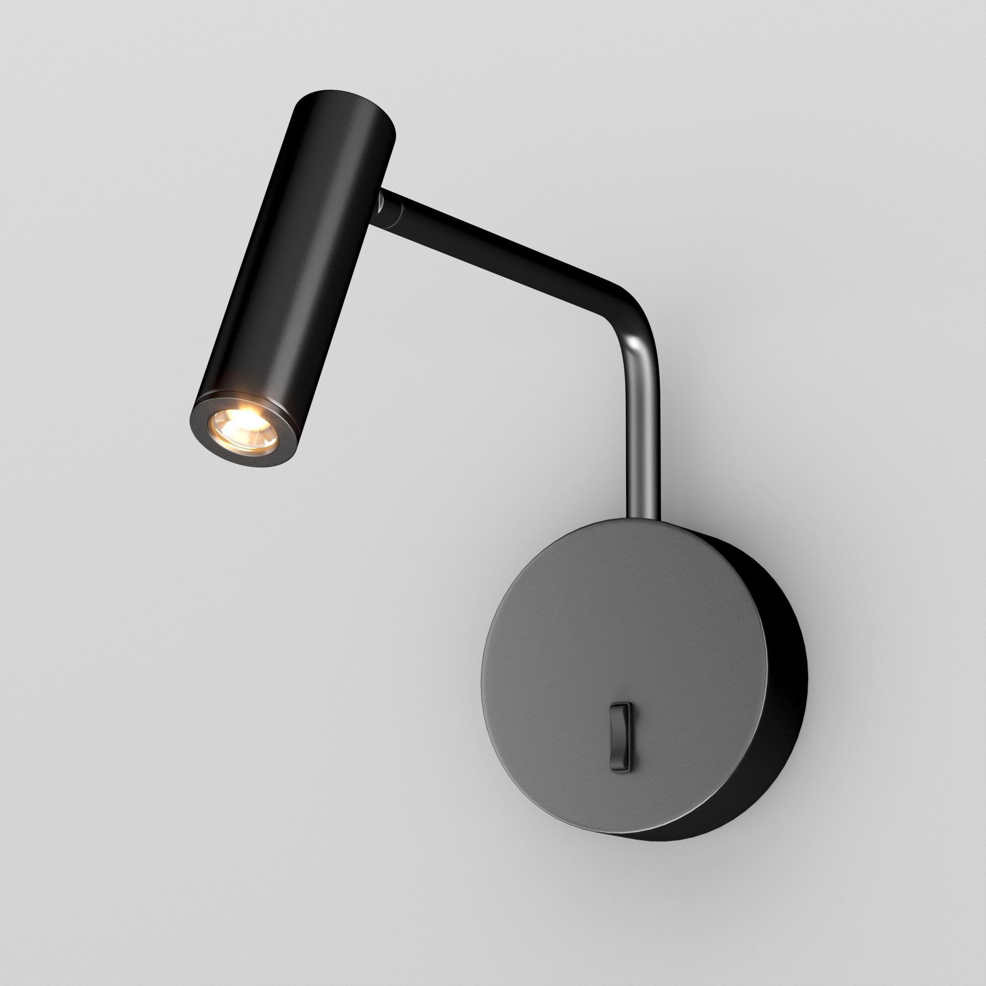 Накладной настенный светильник. Мощность 3 Вт, св. поток 180 лм, 60 лм/Вт, теплый 3000К, CRI>90, угол 20°, напряжение питания 230 В. Черный корпус из алюминия (основание, ножка, светоизлучаль в форме спота), степень защиты IP20. Размер основания Ø100×31 мм, размер ножки Ø12,5×72×178мм, размер светоизлучателя Ø25×100 мм. Драйвер встроенный, пульсация <1%