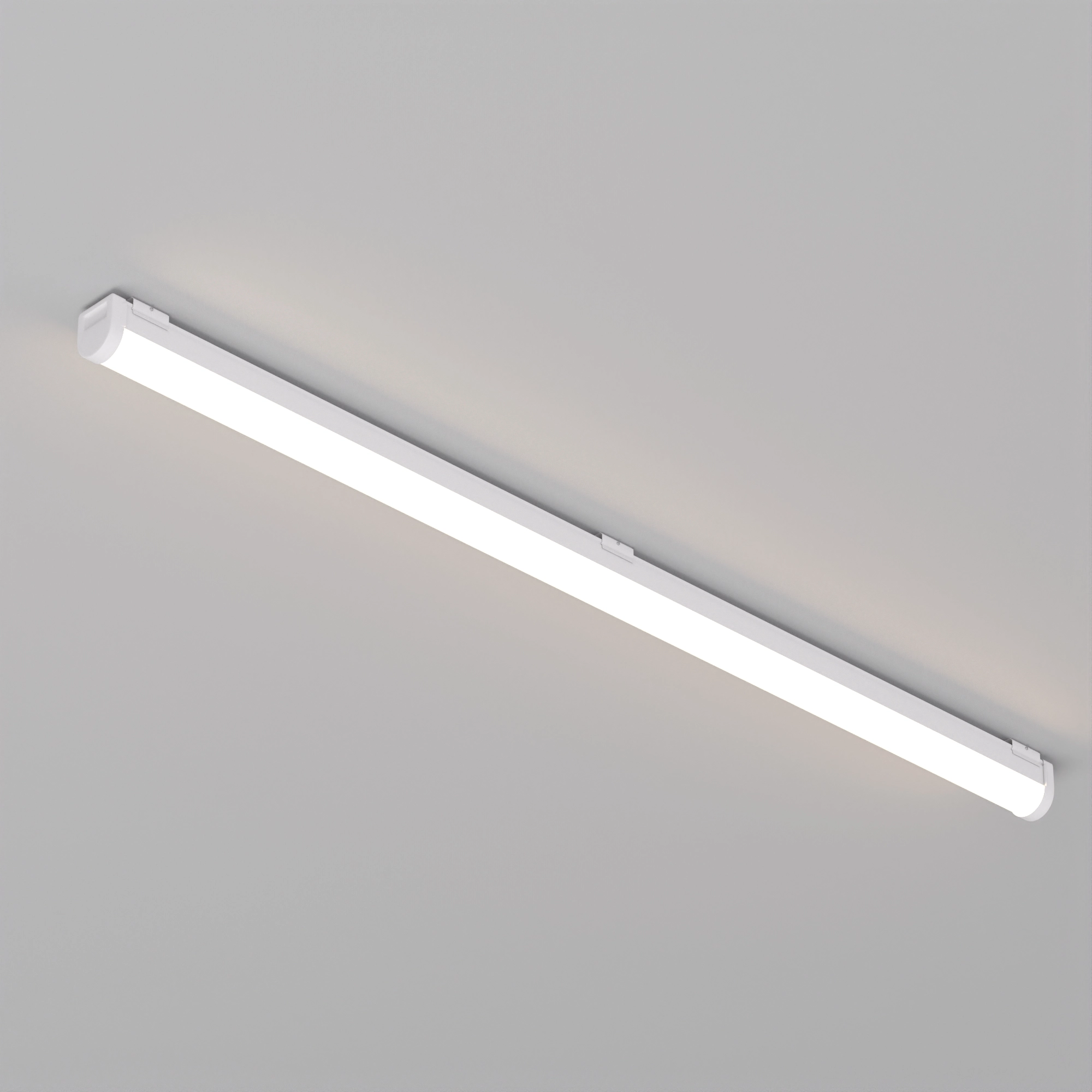Накладной светильник 40 Вт. Цвет БЕЛЫЙ ТЁПЛЫЙ 3000K, св.поток 5500лм, CRI(Ra)>80, угол свечения 120°. Корпус прямоугольный, белый пластик, влагозащищенный IP65. Размер LxWxH 1500x67x68мм. Питание AC 220-240В, 40 Вт, драйвер встроенный. Коннектор питания 030992 поставляется отдельно. Скобы для накладного монтажа в комплекте. Максимальная мощность для подключения в линию 300 Вт.
