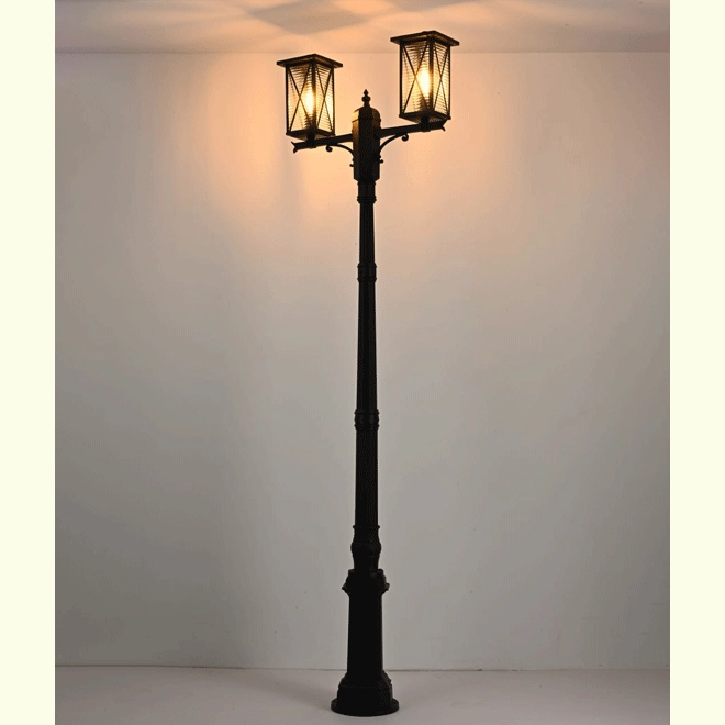 Светильник напольный садово-парковый. Материал: алюминиевый сплав , стекло. Напряжение 220-240V 50Hz. 2*E27. Мощность 2*100W. Размер: 720*2560мм. IP44. В основании светильника сделан специальный лючок для более удобного подключения. Закладные элементы входят в комплект.  Цвет: черный.