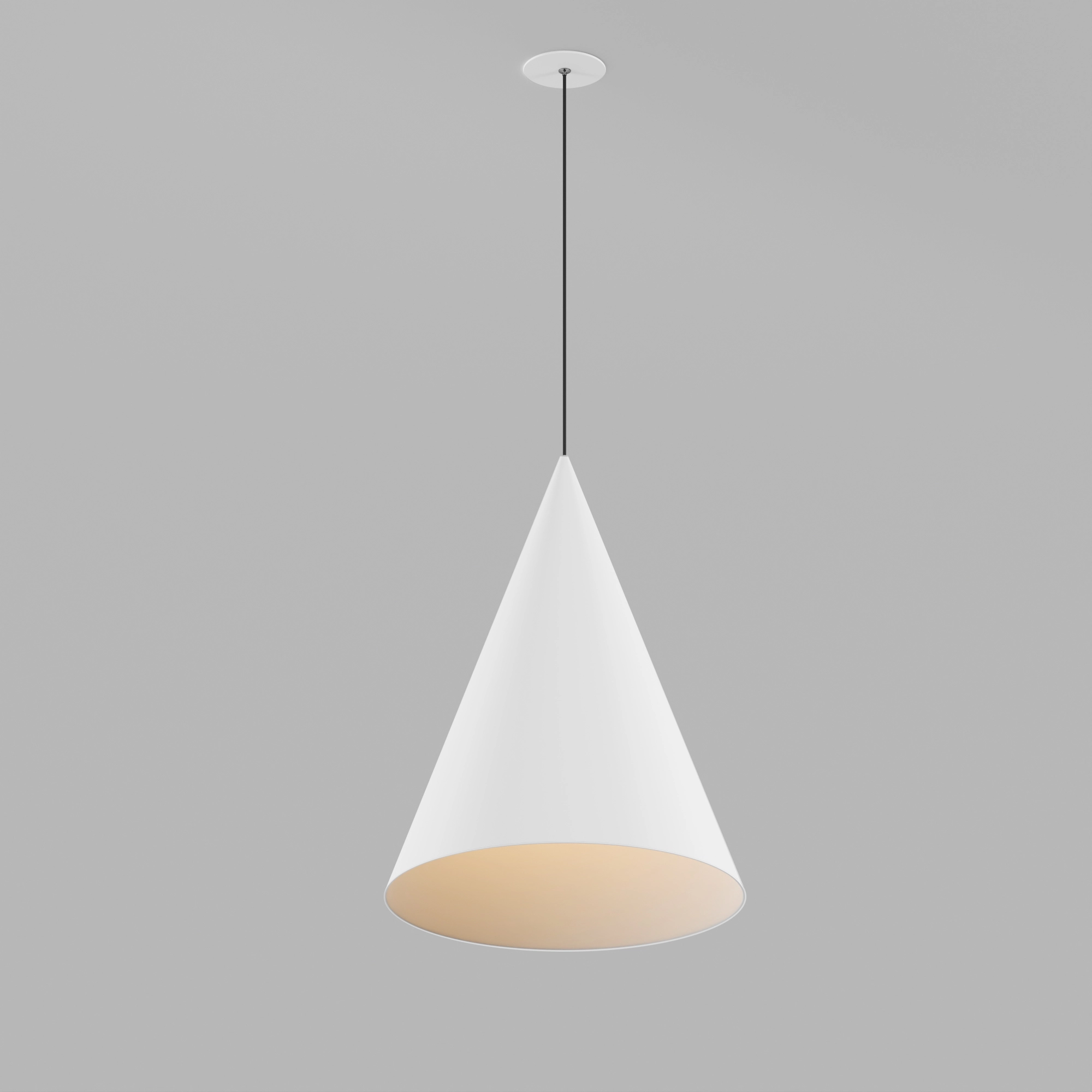 Подвесной светильник. Мощность 14 Вт, св. поток 1250 лм, 87 лм/Вт, теплый 3000 K, CRI>90, угол 36°, напряжение питания 230 В. Белый корпус из алюминия в форме конуса с белой внутренней поверхностью, линза-рассеиватель из PMMA, степень защиты IP20. Размер: диаметр 350 мм, высота 420 мм. Монтаж подвесной, длина подвеса 2000 мм, регулируемая. В комплекте 2 вида чаш. Габариты встраиваемой чаши: Ø 80x23 мм. Габариты накладной чаши Ø140x55 мм. Драйвер 27-42 В, 350 мА, пульсация <1%. Управление по TRIAC.
