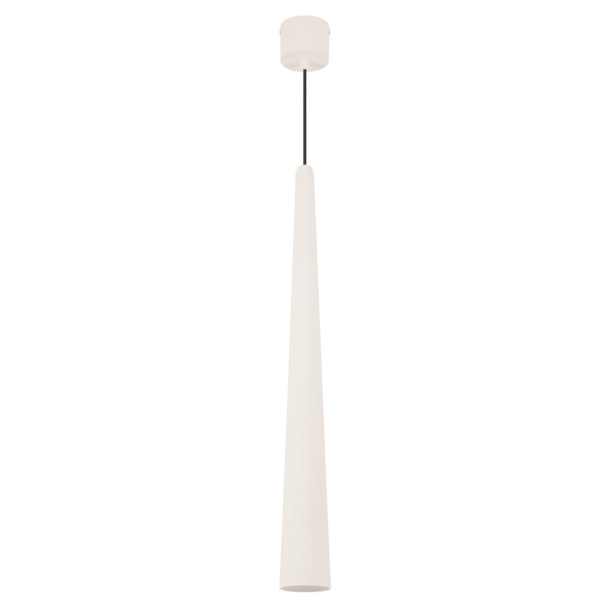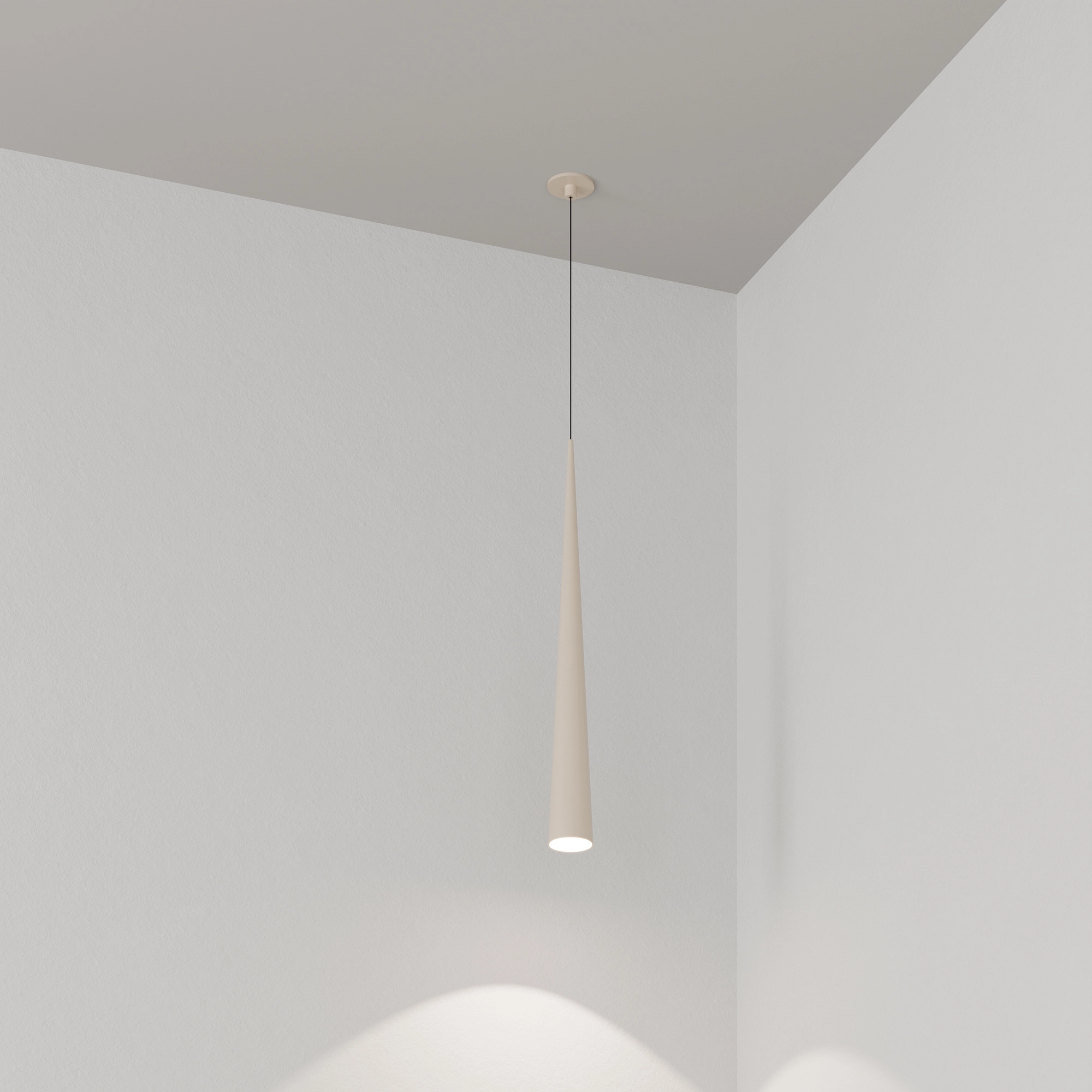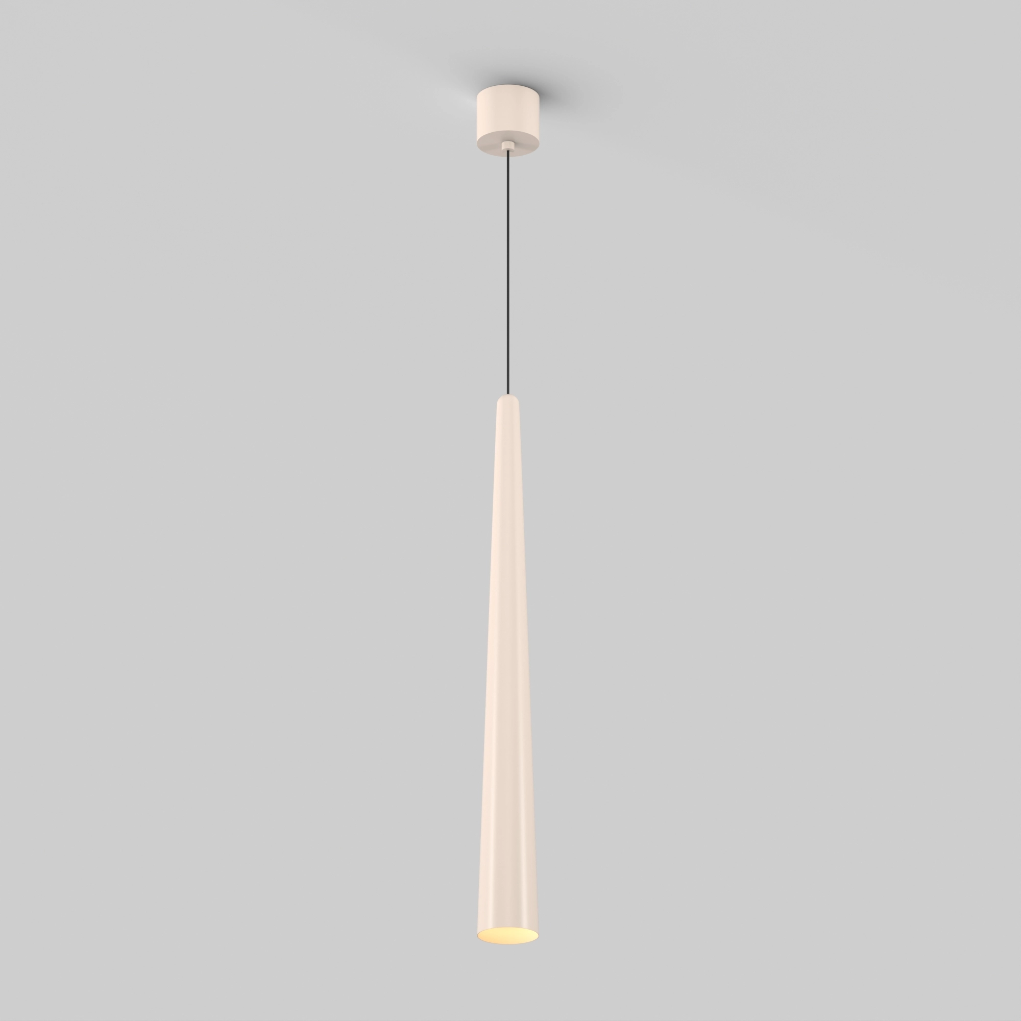 Подвесной светильник. Мощность 5 Вт, св. поток 400 лм, 70 лм/Вт, теплый 2700 K, CRI>90, угол 36°, напряжение питания 230 В. Кремовый конусообразный вытянутый корпус из алюминия, линза из PMMA, степень защиты IP20. Размер: диаметр 76 мм, высота 670 мм. Монтаж подвесной, длина подвеса 1330 мм, регулируемая. В комплекте 2 вида чаш. Габариты встраиваемой чаши: Ø 80x41 мм. Габариты накладной чаши Ø80x60 мм. Драйвер 2,8-12В, 500 мА, пульсация <1%.