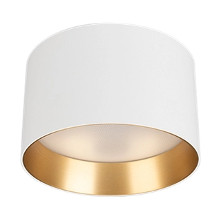 Накладной светильник. Мощность 15 Вт, св. поток 1100-1160 лм, 80-85 лм/Вт, теплый 2700 K, теплый 3300K, дневной 4000K (переключается), CRI>90, угол 80°, напряжение питания 230 В. Белый круглый корпус из алюминия с золотой вставкой, экран PC, степень защиты IP54. Размер: диаметр 140 мм, высота 85 мм. Монтаж накладной. Драйвер 26-42 В, 350 мА, пульсация <2%.