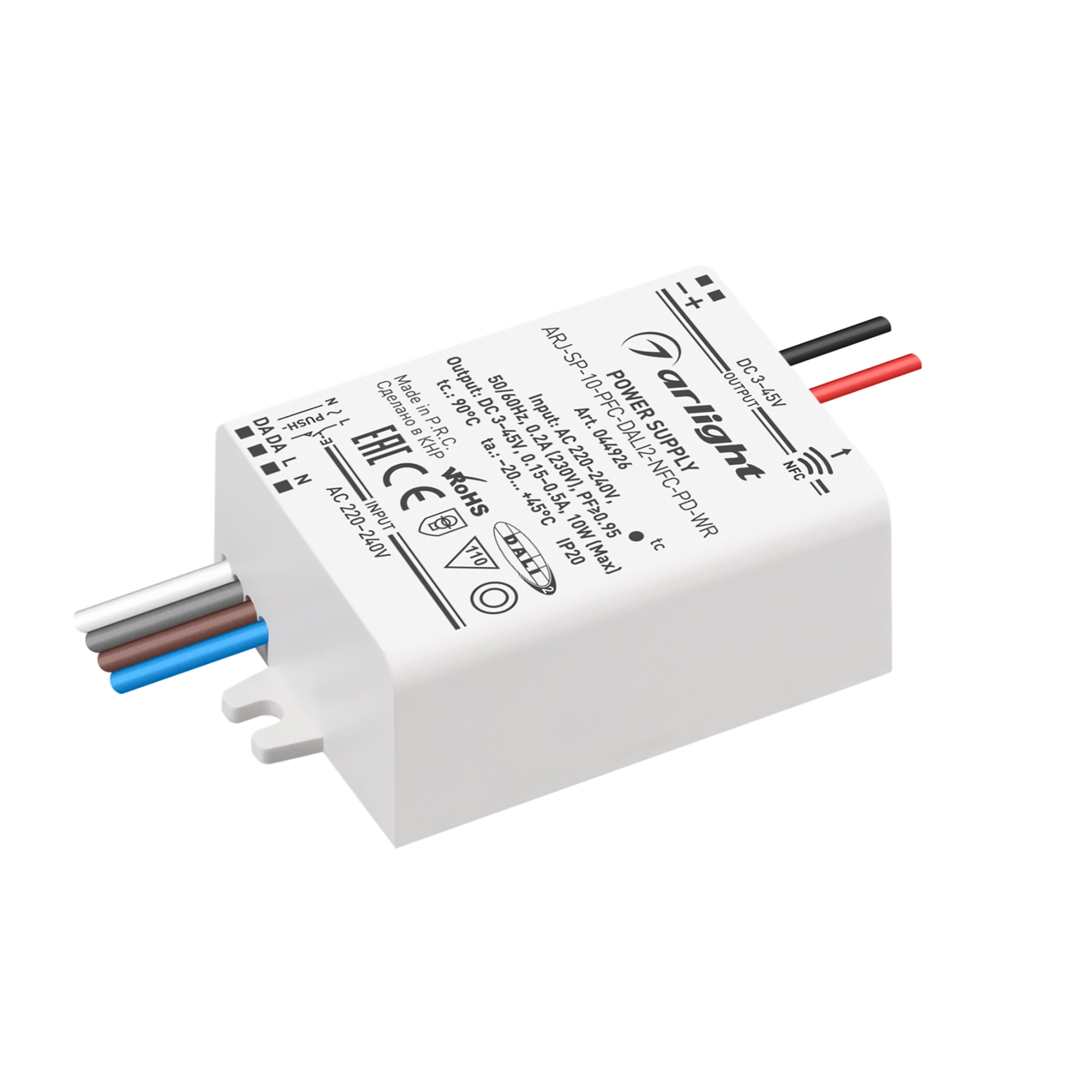 Диммируемый токовый блок питания с управлением DALI 2.0 и функцией Push Dim с гальванической развязкой. Питание 220-240AC. Выход 3-45В (150-200 мА),  3-40В (250мА), 3-33В (300мА), 3-28В (350мА), 3-20В (400-500 мА),  10Вт, PF >0,95. Выбор значения выходного тока осуществляется с помощью NFC технологии. Настройки DALI устанавливаются стандартным способом. Размеры 65x40x23 мм.  Гарантия 5 лет.