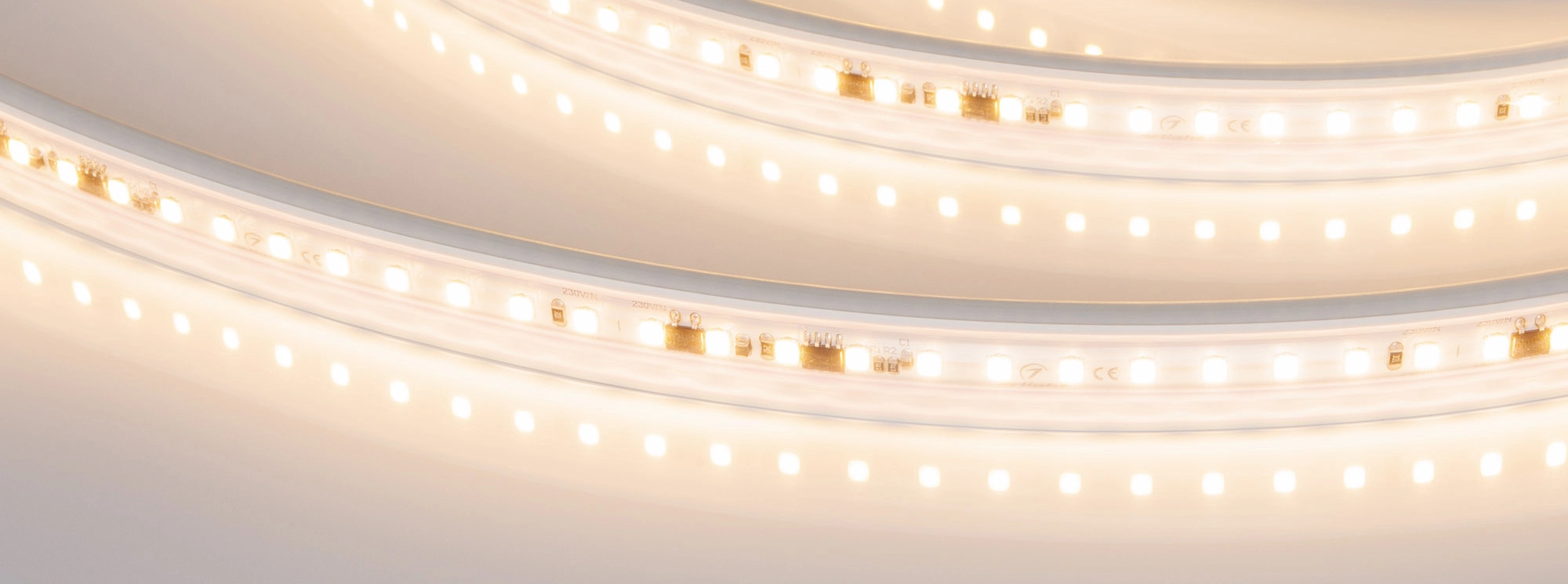 Светодиодная герметичная лента ARL серии A120, IP65 (PVC - трубка ПВХ экструзия). Светодиоды SMD 2835, 120 шт/м, белая плата шириной 12 мм, крепление на силиконовые скобы (скотч 3M отсутствует). Цвет ТЕПЛЫЙ 3000K, индекс цветопередачи CRI>85, угол 120°. Питание 230 В, мощность 15 Вт/м (450 Вт на 30 м). Размеры 3000x15x6.5 мм. Мин. отрезок 100 мм, 12 светодиодов. Цена за 1 м.