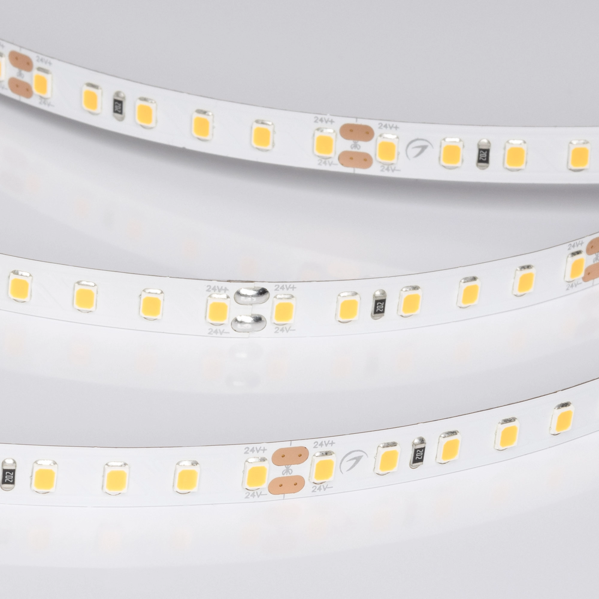 Светодиодная лента UL серии A120. Светодиоды SMD 2835, 120 шт/м, белая плата шириной 8 мм, скотч 3M. Цвет ТЕПЛЫЙ 3000K, индекс цветопередачи CRI>90, угол 120°. Питание 24 В, мощность 2 Вт/м (10 Вт на 5 м). Размеры 5000x8x1.5 мм. Мин. отрезок 50 мм, 6 светодиодов. Цена за 1 м. Рекомендуется установка на профиль.