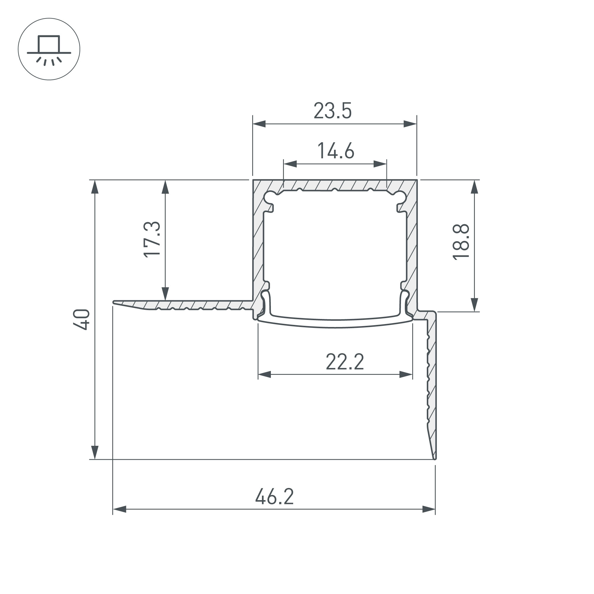 Алюминиевый профиль для светодиодных лент и линеек. Скрытая установка (под строительную отделку). Габаритные размеры (L×W×H): 2000x46,2x40 мм. Ширина площадки для ленты 14,6 мм. Экраны, заглушки и другие аксессуары приобретаются отдельно. Цена за метр.